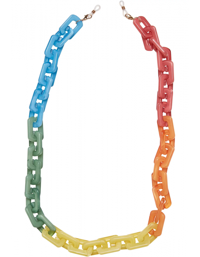Tento barevný řetízek s přechodem, který dodává slunečním brýlím extra vzpruhu, je velmi praktický. Uzávěry se připevňují snadno a nenápadně. Využitím řetízku, který se skládá z velkých řetízkových článků z lehkého akrylu, lze brýle nosit uvolněně na krku.