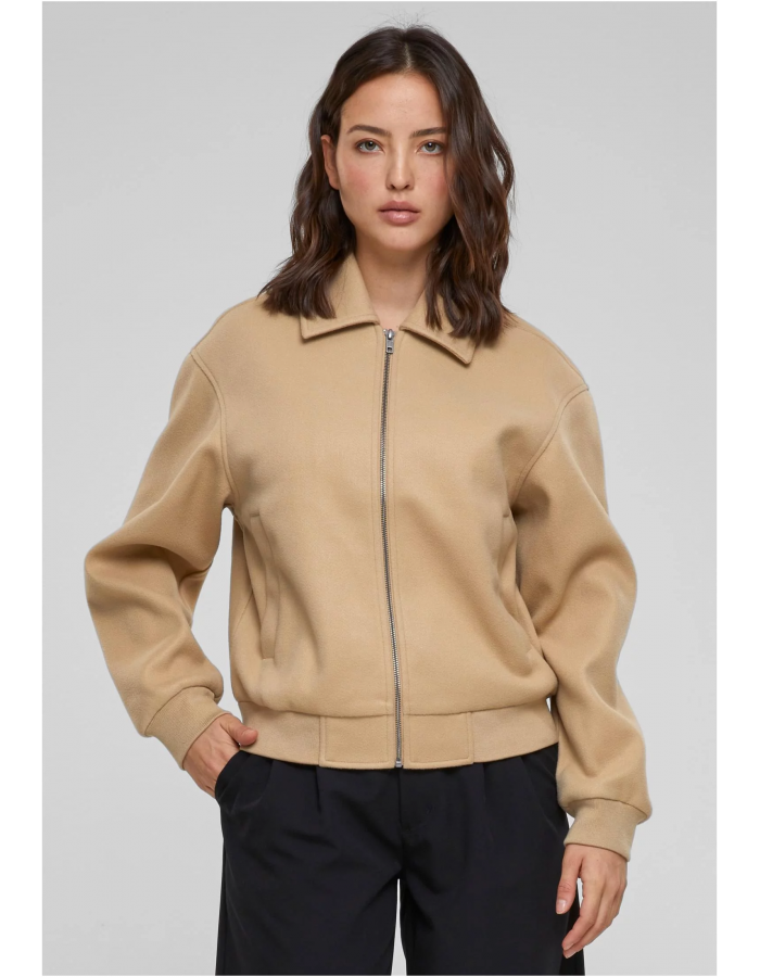 Dámská bunda nabízí sportovní a ležérní vzhled se stahovacím límcem a širokými žebrovanými manžetami na rukávech a spodním lemu. Dále je vybavena předním zipem a dvěma bočními kapsami se skrytými patentkami. Polyesterová tkanina vypadá jako vlna a poskytuje stabilitu. Bunda je podšitá měkkým taftem a má oversize střih se spadlými rameny.