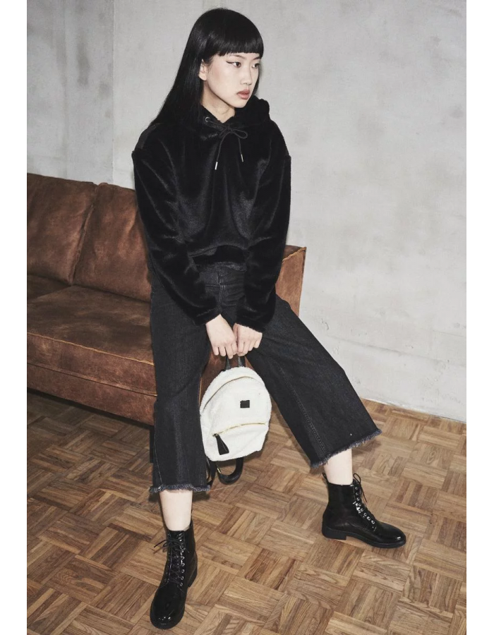 Díky střihu s vysokým pasem je Culotte velmi trendy. Klasický denimový vzhled a neprošívaný lem kotníku se světlými třásněmi jsou dalšími detaily. Kalhoty mají klasické zapínání na zip, dvě boční a zadní kapsy a poutka na opasek.