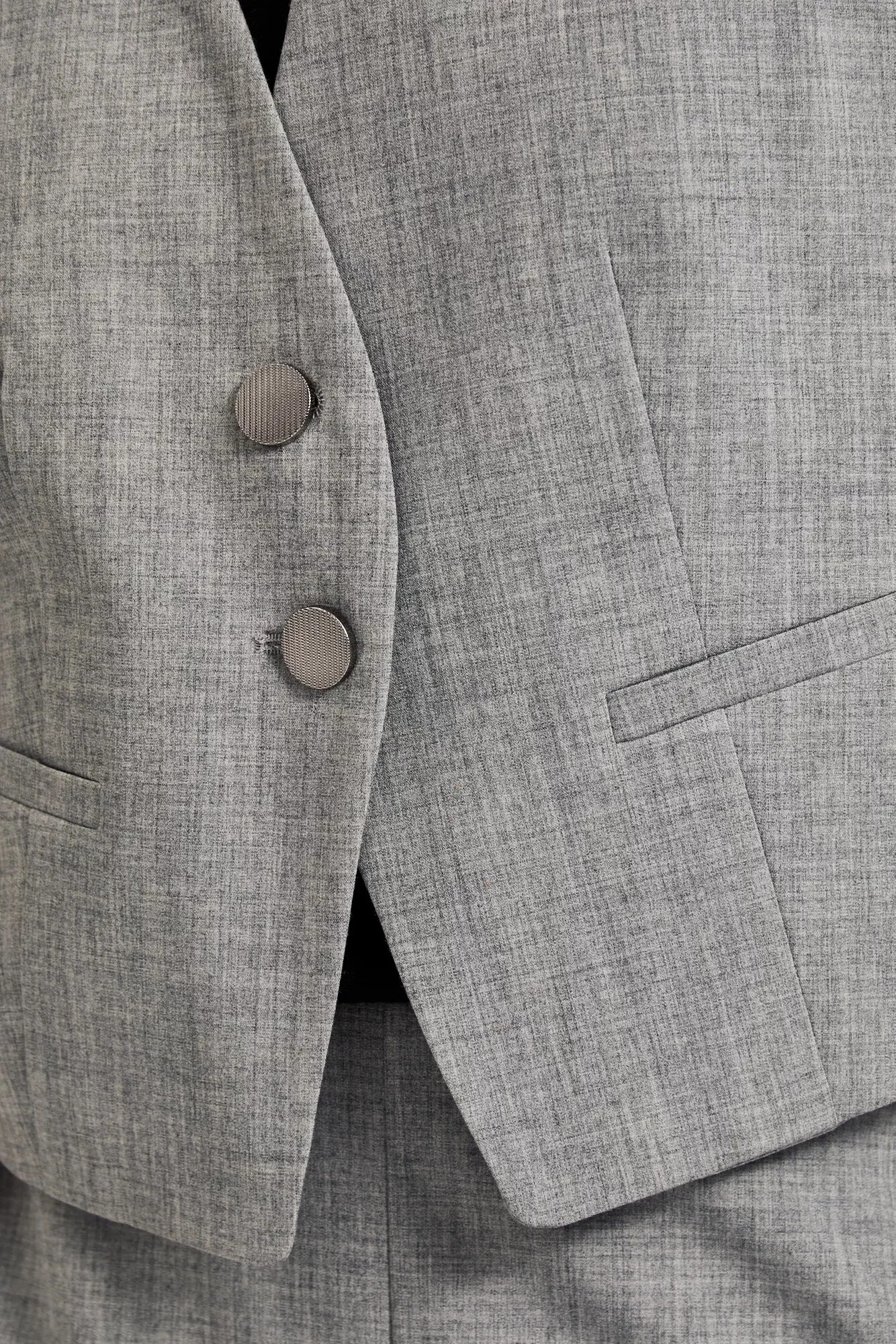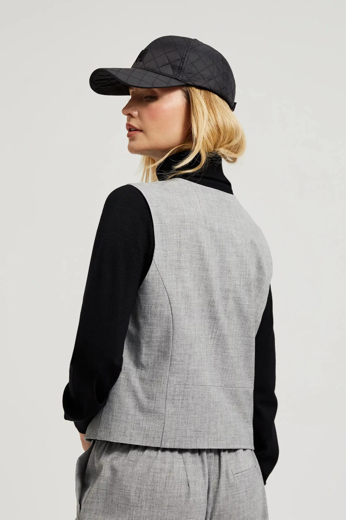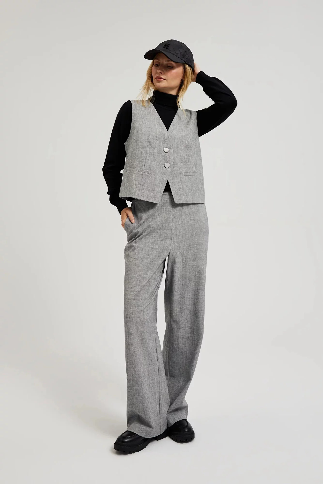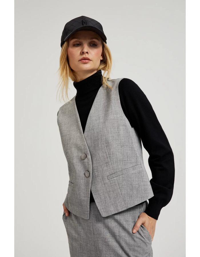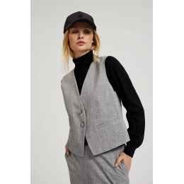 90%POLYESTER, 6%VISKÓZA, 4%ELASTAN Elegantní, bez vzoru vesta v šedé barvě, vyrobená z hladkého polyesteru. Model jednřadý s podšívkou, vybavený praktickými kapsami. Produkt má knoflíky, které mu dodávají eleganci. Složení produktu je převážně polyester. Ideální na speciální příležitosti, jako jsou slavnostní setkání nebo rande. Dokonale se osvědčí také jako neformální prvek oblečení na každý den do práce. Sako bude ladit s kalhotami, sukněmi i elegantními šaty, dodávajíc celku šmrnc a třídu.