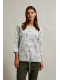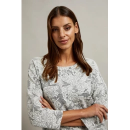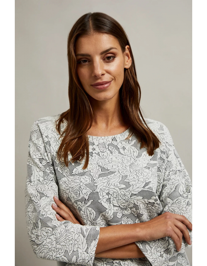 75%POLYESTER, 25%BAAVLNA Dámská mikina, vyrobená z příjemného materiálu v bílé a šedé barvě s vytlačovaným květinovým vzorem. Má dlouhý rukáv a lodičkový výstřih, což jí dodává elegantní vzhled. Mikina se zapíná vpředu na šněrování. Tato halenka se skvěle hodí pro mnoho příležitostí - jak na každodenní nošení, tak na setkání s přáteli nebo na rande. Dokonale se hodí jak k džínům, tak k sukni nebo elegantním kalhotám. Díky univerzálnímu vzoru bude ideálním doplňkem mnoha stylizací.