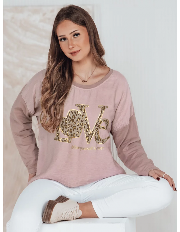 Halenka s dlouhým rukávem v volném střihu, která zajišťuje pohodlí a styl na každý den. Zlatý nápis "LOVE" s módním leopardím vzorem dodává charakter a eleganci. Ideální k džínům nebo legínám, vytváří ležérní stylizace pro každou příležitost.
