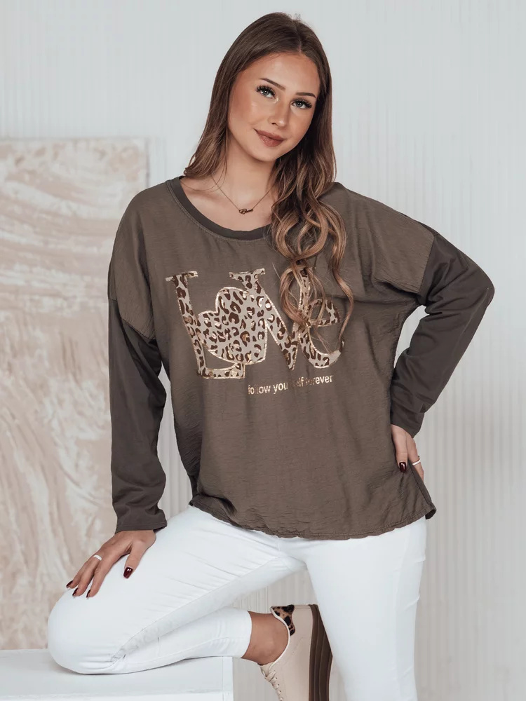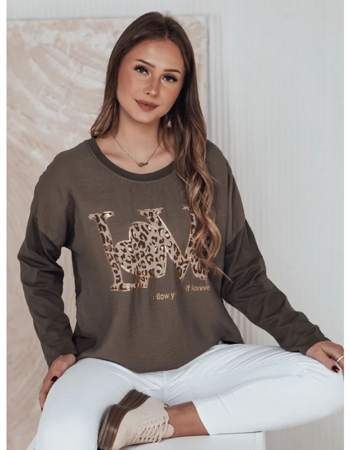 Halenka s dlouhým rukávem v volném střihu, která zajišťuje pohodlí a styl na každý den. Zlatý nápis "LOVE" s módním leopardím vzorem dodává charakter a eleganci. Ideální k džínům nebo legínám, vytváří ležérní stylizace pro každou příležitost.