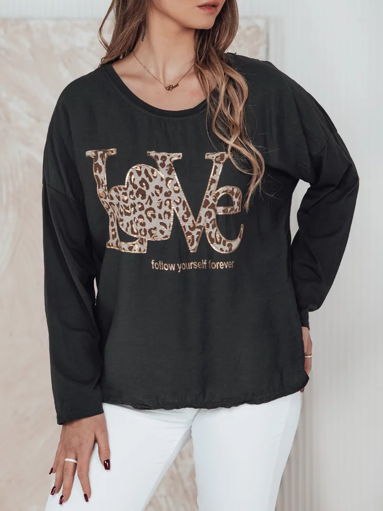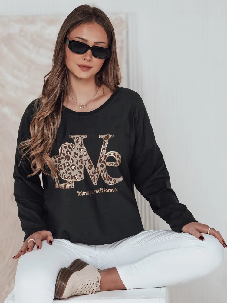 Halenka s dlouhým rukávem v volném střihu, která zajišťuje pohodlí a styl na každý den. Zlatý nápis "LOVE" s módním leopardím vzorem dodává charakter a eleganci. Ideální k džínům nebo legínám, vytváří ležérní stylizace pro každou příležitost.