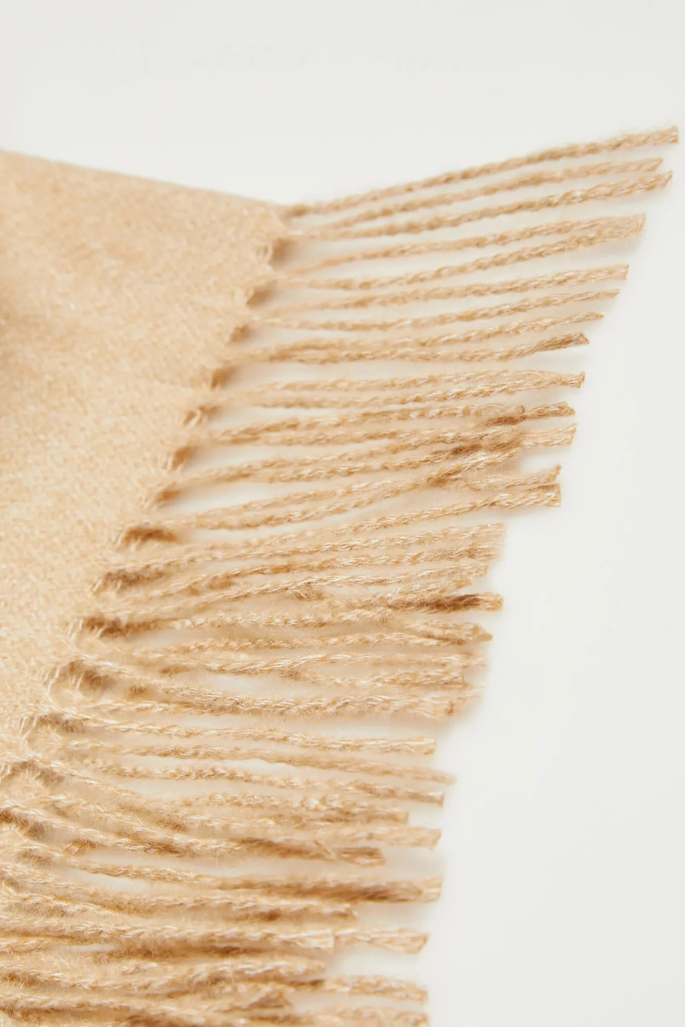 50%POLYESTER, 40%VISKÓZA, 10%METALICKÁ NITKA Šála v béžové barvě je ideálním doplňkem do vaší kolekce doplňků. Vyrobený z měkkého melírovaného materiálu, ozdobený třásněmi, ti zajistí nejen teplo, ale také stylový vzhled. Tento elegantní šátek se skvěle hodí do chladnějších dnů a dokonale doplní váš outfit. Hodí se jak k ležérním, tak i k formálnějším stylizacím. Dokonale ladí jak s kabátem, tak s džíny a svetrem. Díky němu budeš vždy vypadat módně a stylově.