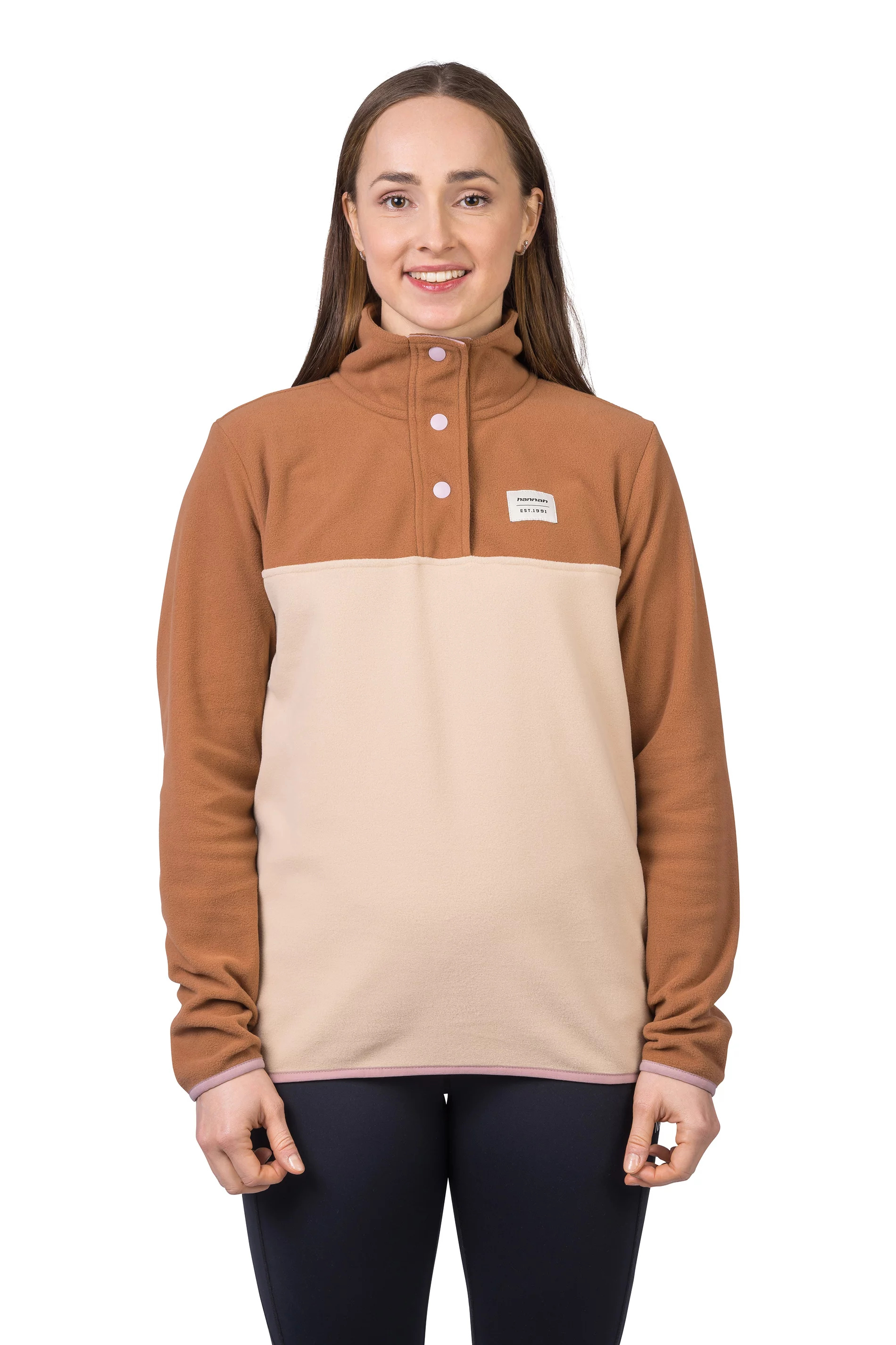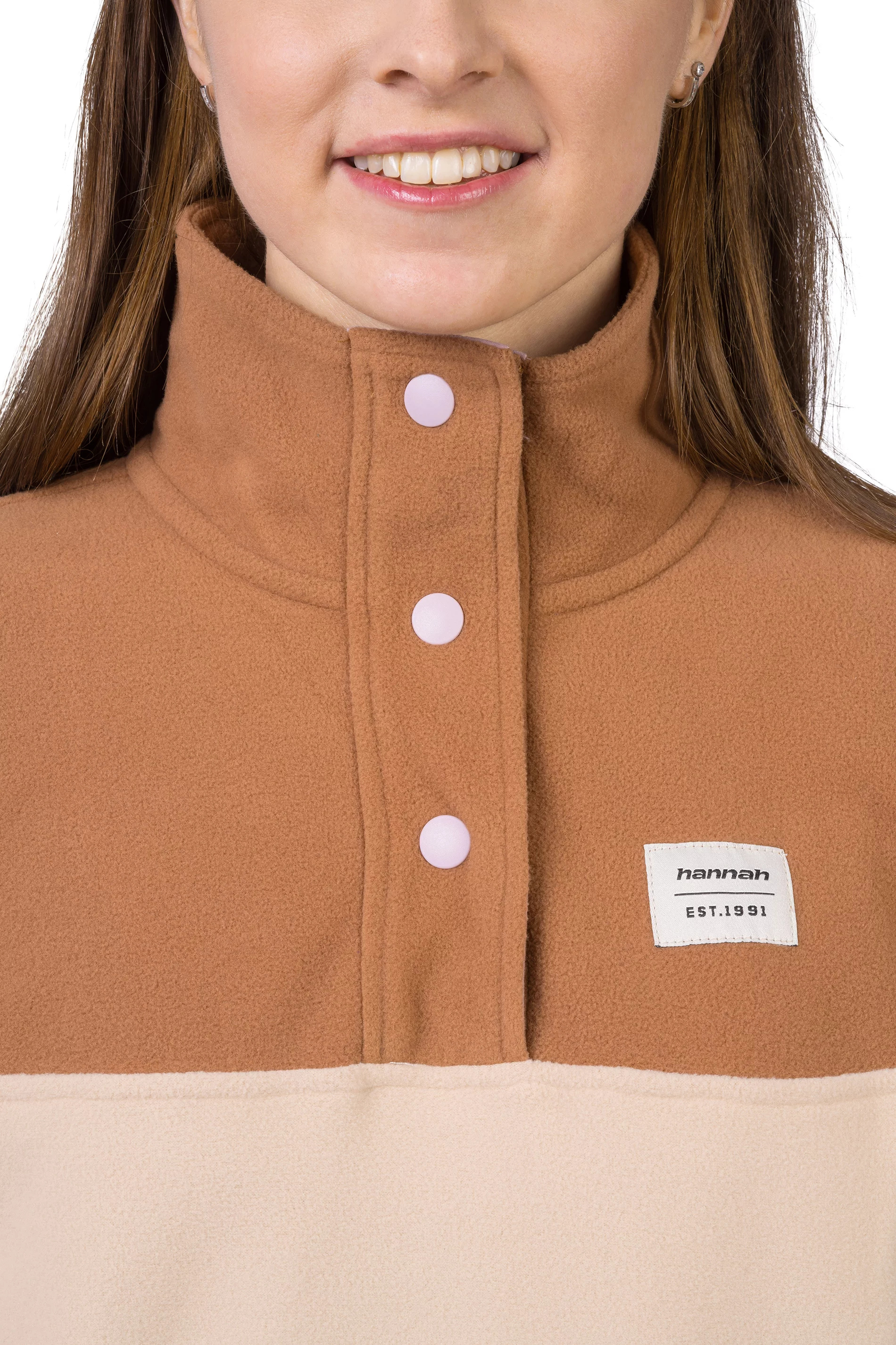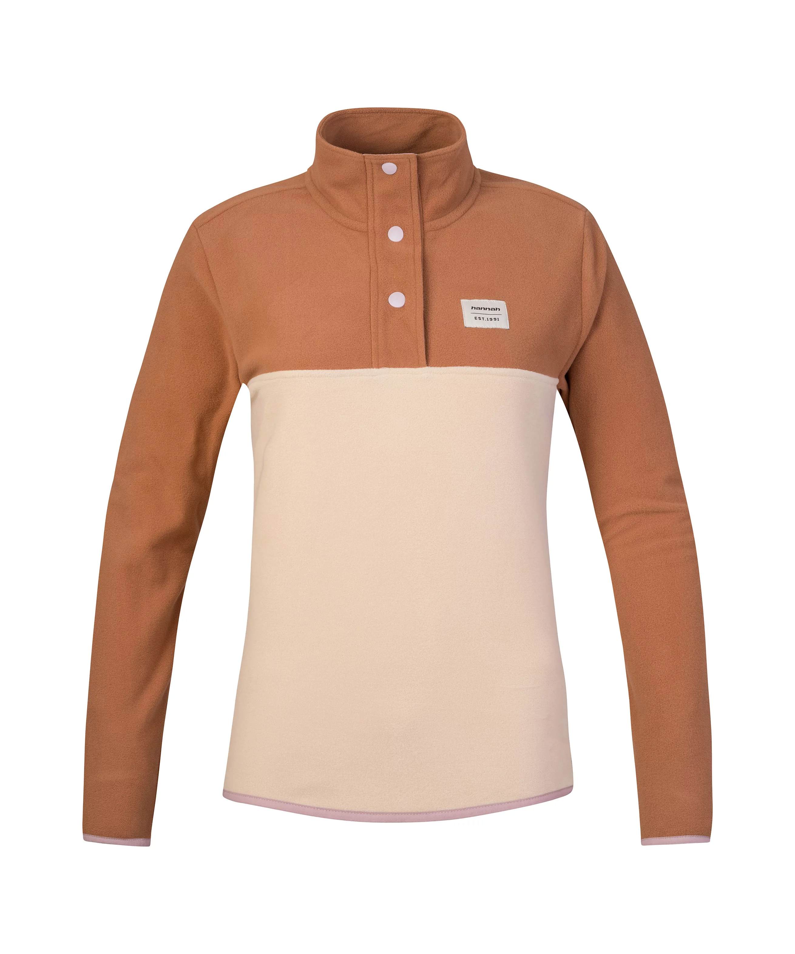 Mikina z jemného, elastického a hřejivého fleece materiálu Polarsoft Micro, který má zároveň nízkou hmotnost a dlouhotrvající životnost. Střih řešený přes hlavu, částečné zapínání mikiny na patentky, které přechází do zvýšeného komfortního stojáčku. Anatomicky tvarované rukávy a spodní okraj jsou lemované gumou. Retro design a barevné členění čerpá z původních kořenů značky Hannah.