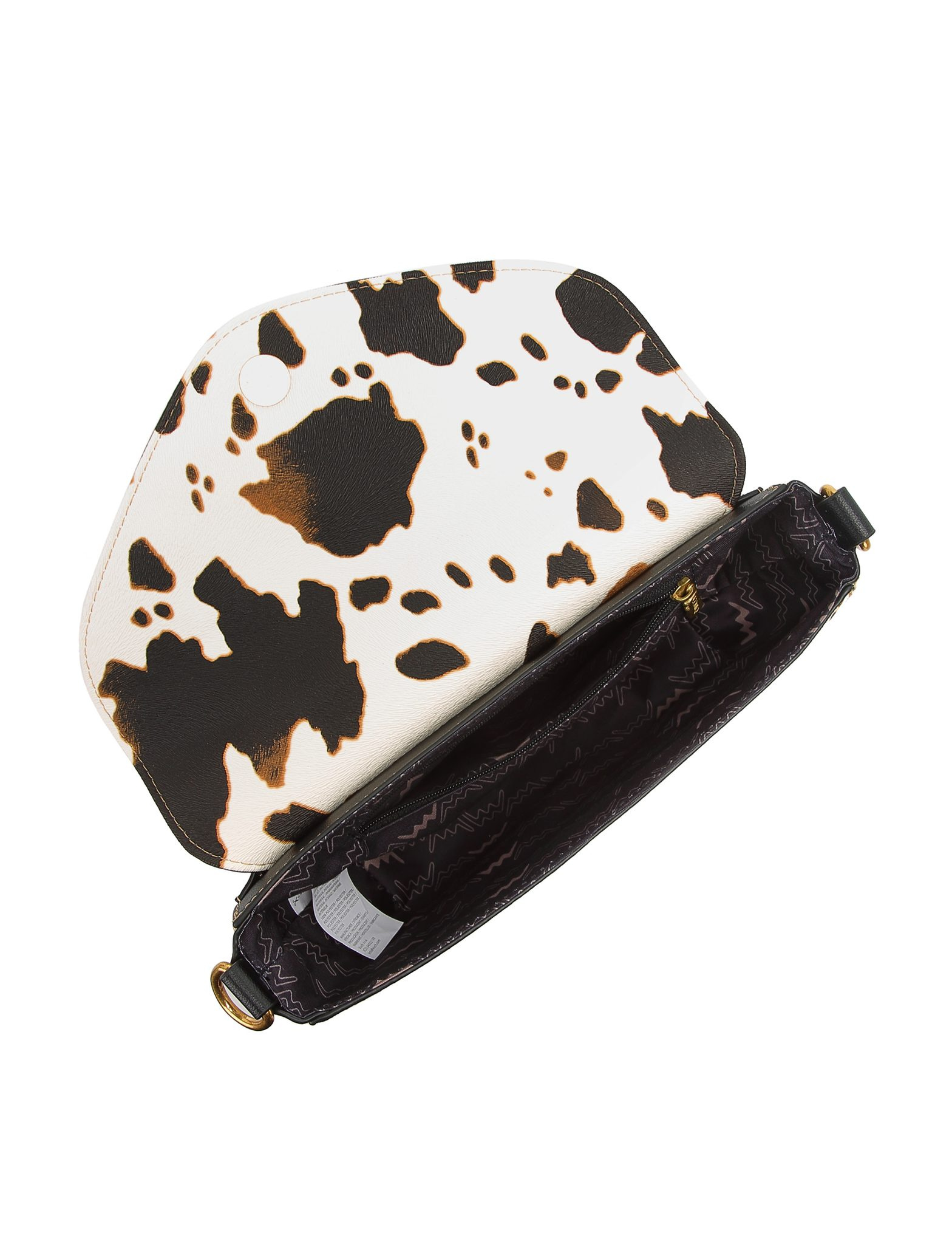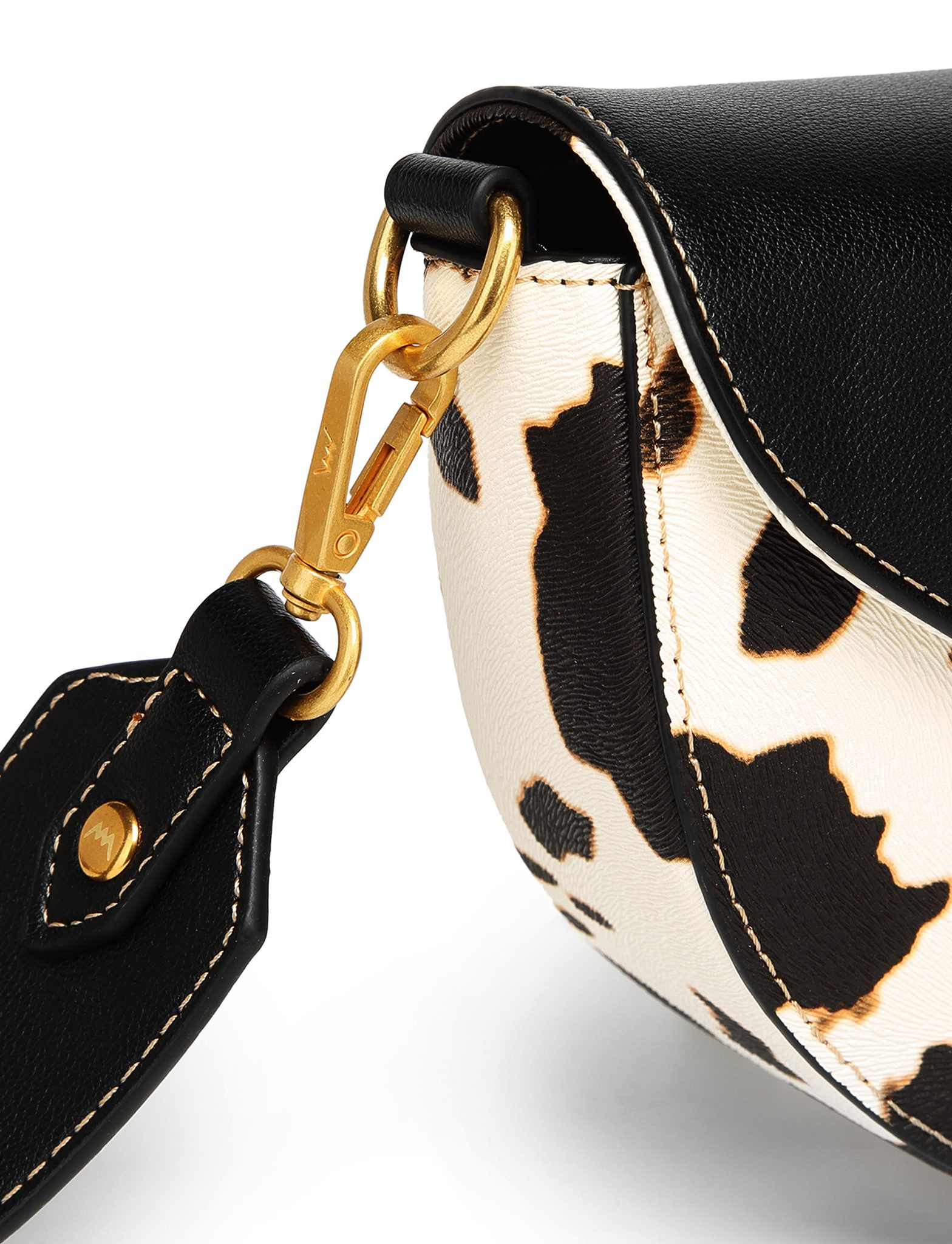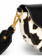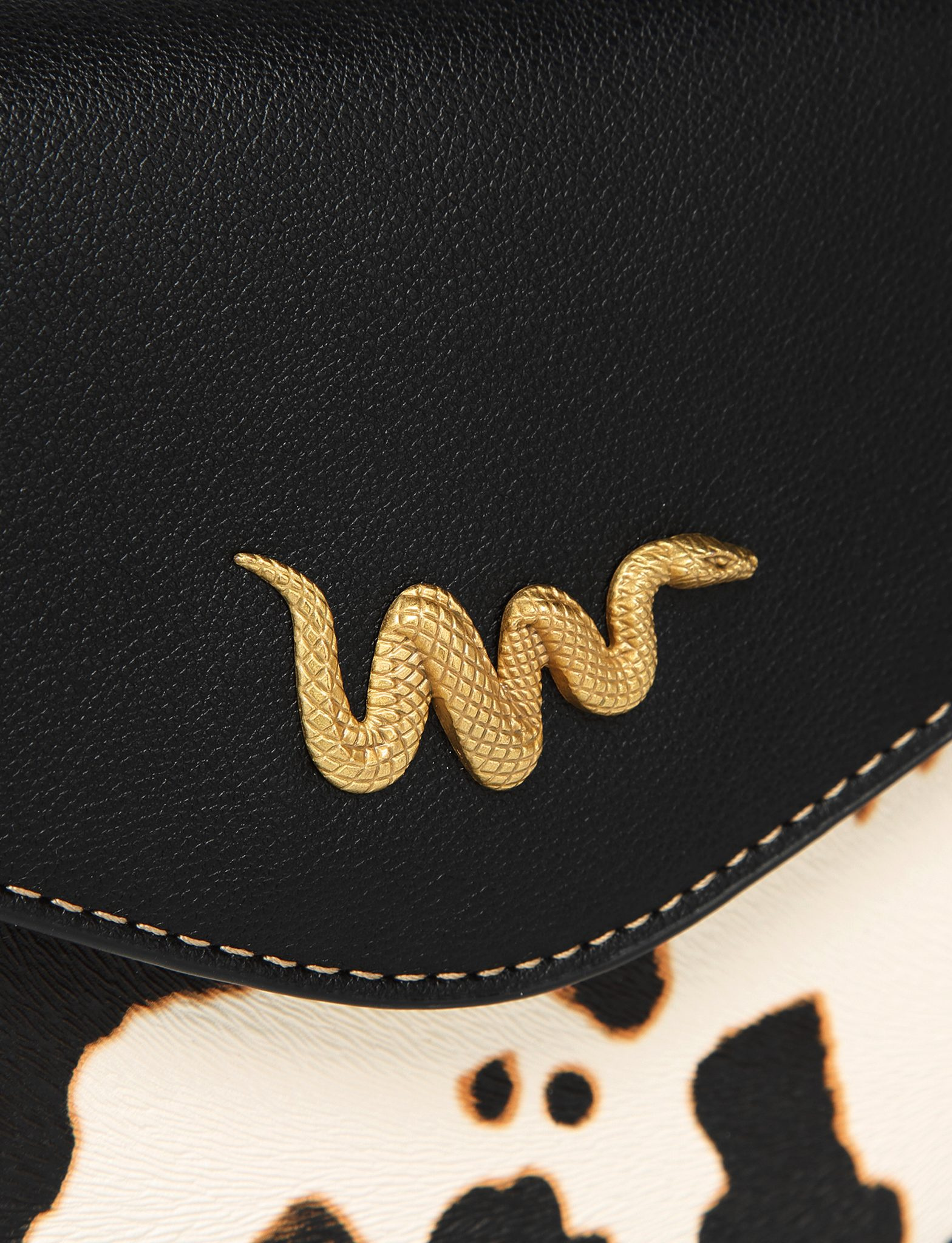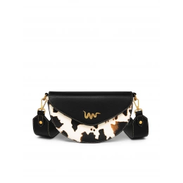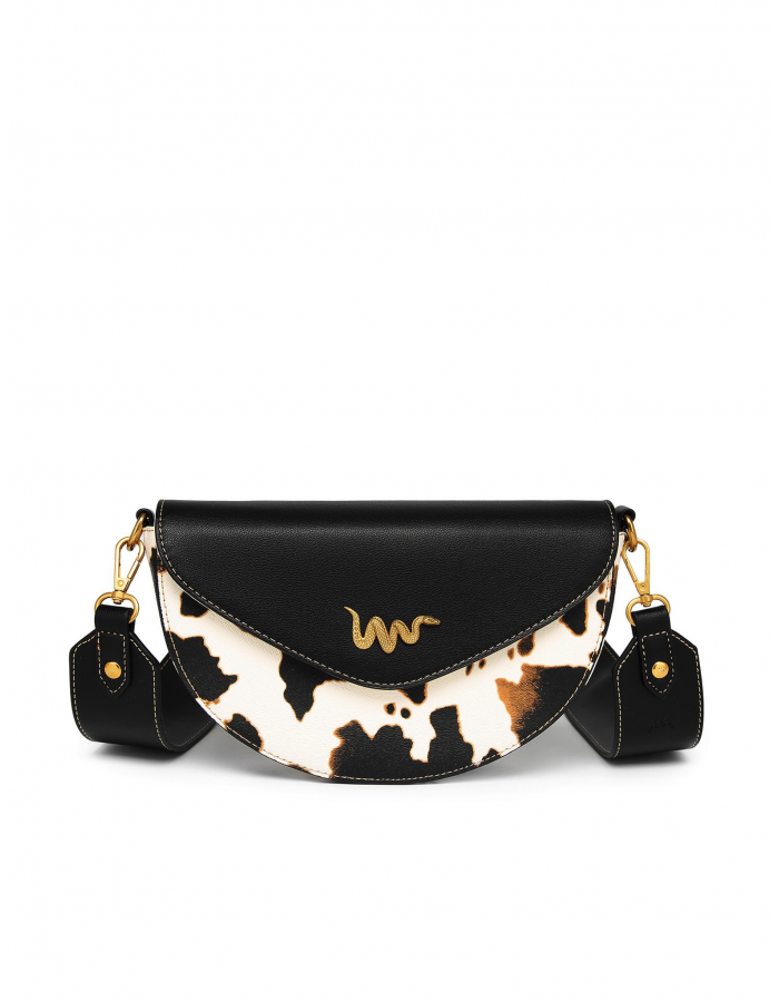 Tento model spojuje ikonickou černou klopu s výrazným kravským vzorem, který je neopakovatelný – u každého kusu je rozložení skvrn unikátní. Zlaté kování a jemné logo ve tvaru hada podtrhují exkluzivitu této edice. Je to kousek pro ženu, která nepotřebuje křičet, aby byla slyšet.