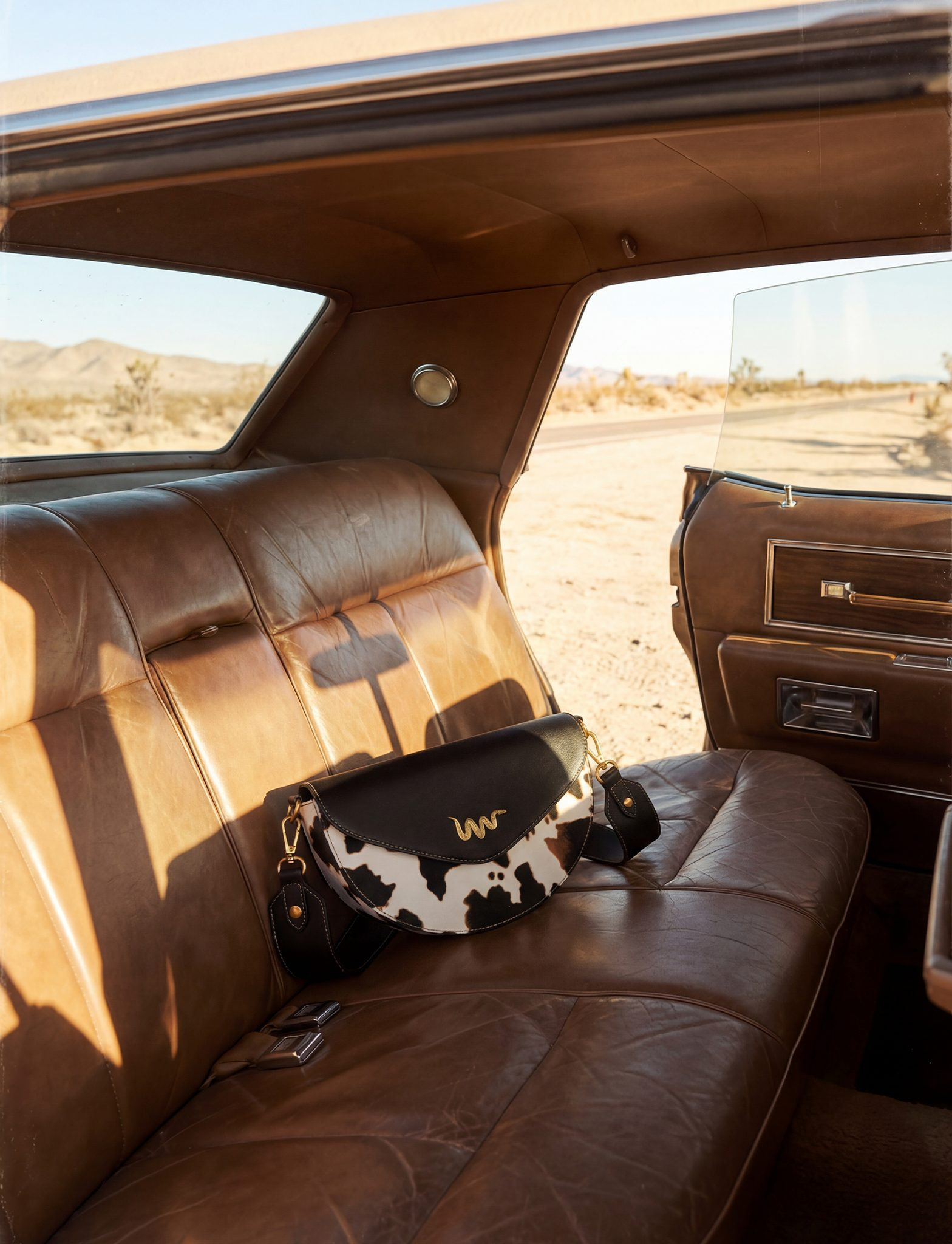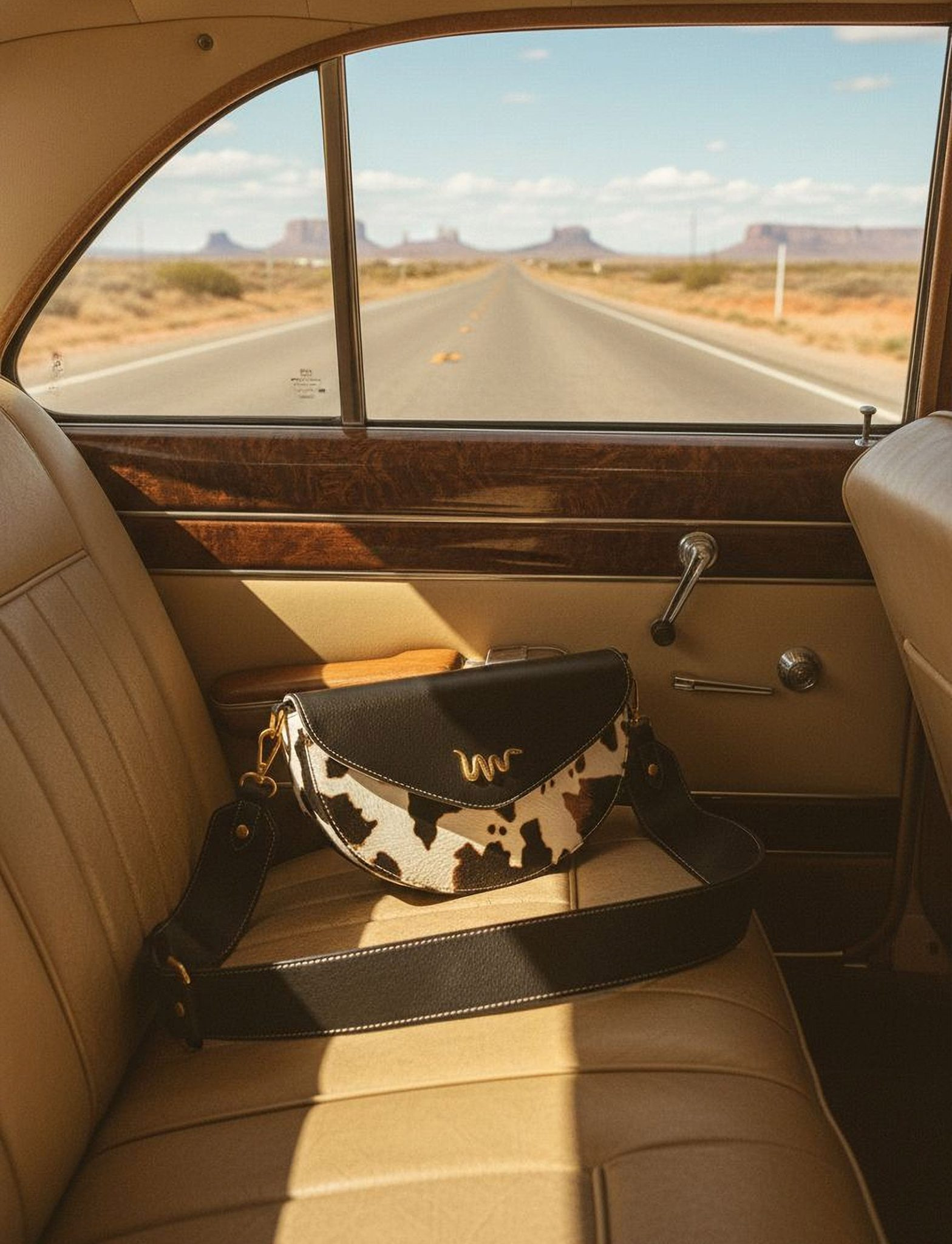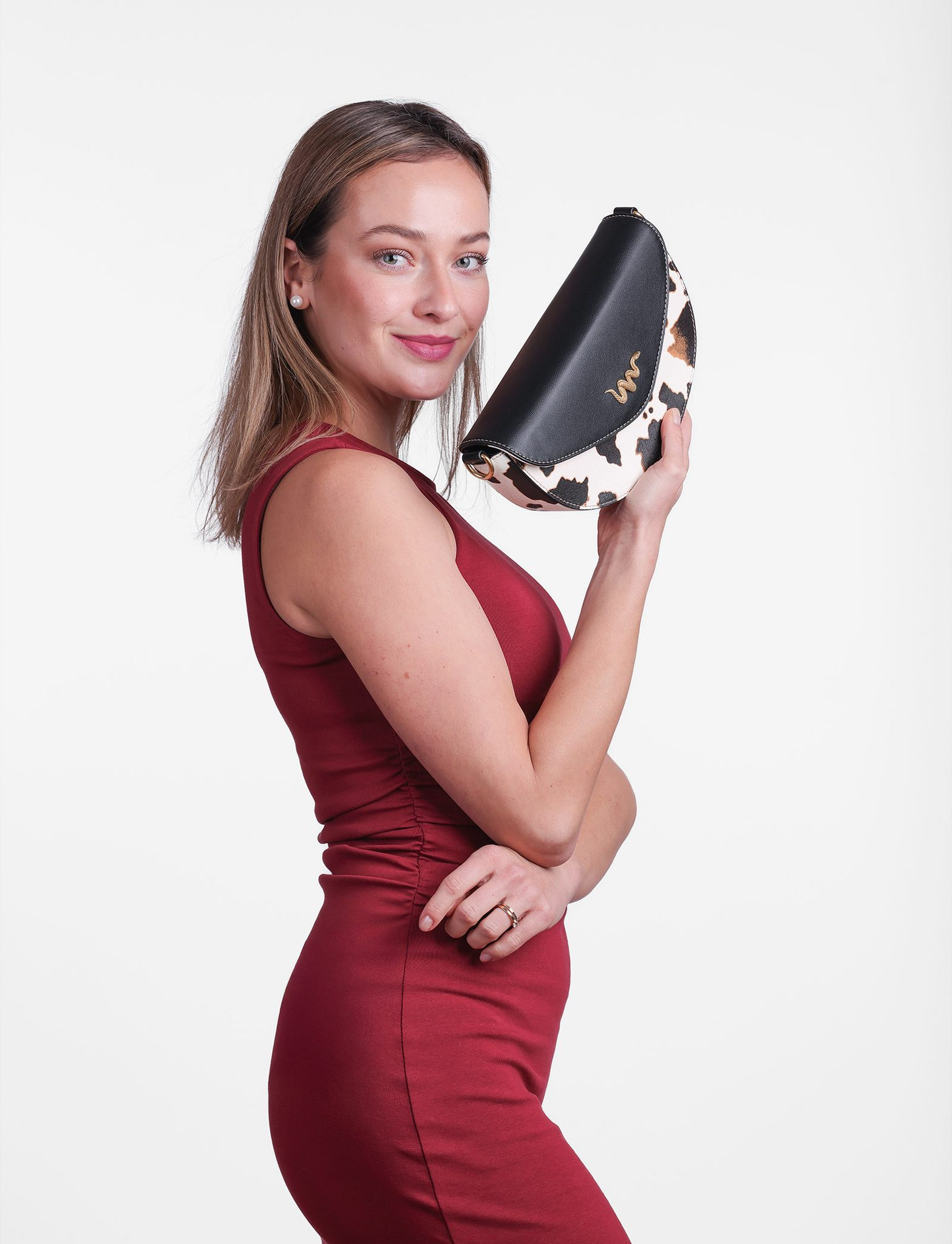 Tento model spojuje ikonickou černou klopu s výrazným kravským vzorem, který je neopakovatelný – u každého kusu je rozložení skvrn unikátní. Zlaté kování a jemné logo ve tvaru hada podtrhují exkluzivitu této edice. Je to kousek pro ženu, která nepotřebuje křičet, aby byla slyšet.