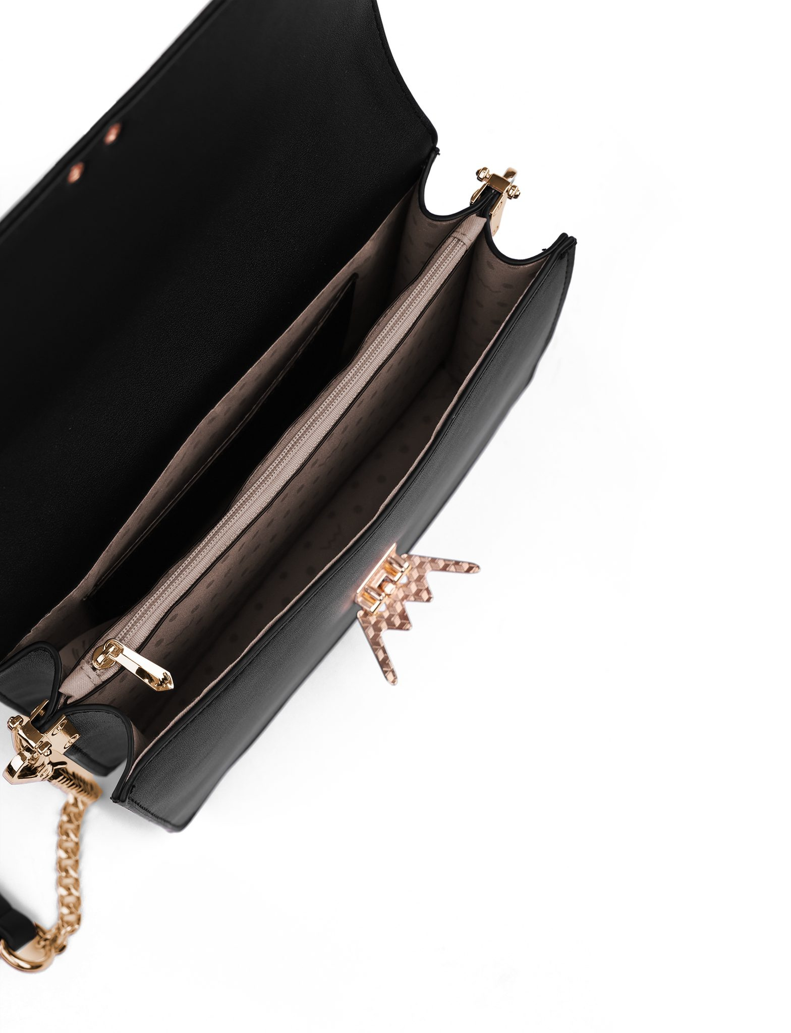 Pevná kabelka s klopou, která dává najevo, že ví, co chce. Kombinace koženky a výrazného kování působí sebevědomě a zároveň elegantně. Nový design spony jí dodává neokoukaný detail, který zaujme na první pohled. Stylový kousek pro dny, kdy chceš outfit vyladit na maximum.
