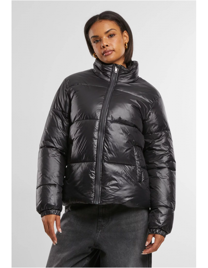 Puffer bunda s lesklým povrchem. Bunda má zapínání na zip, vysoký stojací límec a prošívaný design, který poskytuje tepelnou izolaci. Rukávy i spodní lem jsou zakončené elastickými manžetami pro lepší uchování tepla. Tento styl bundy je vhodný pro chladnější období a kombinuje módní vzhled s praktickou ochranou před zimou.