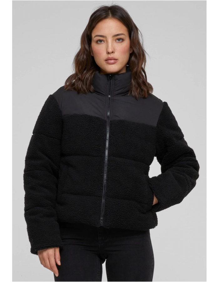 Díky silnému polstrování a chytrému mixu materiálů je tato krátká dámská bunda autentickým módním kouskem. Její stojáček a oblast ramen jsou vyrobeny z hladkého polyesteru, zatímco zbytek bundy má nadýchanou strukturu Sherpa. Bunda se zapíná na zip a lem lze dále upravit pomocí stahovací šňůrky se zarážkou. Dále jsou dvě boční kapsy opatřeny zipem. Bunda je podšitá polyesterem a taftem. Střih je pravidelný.
