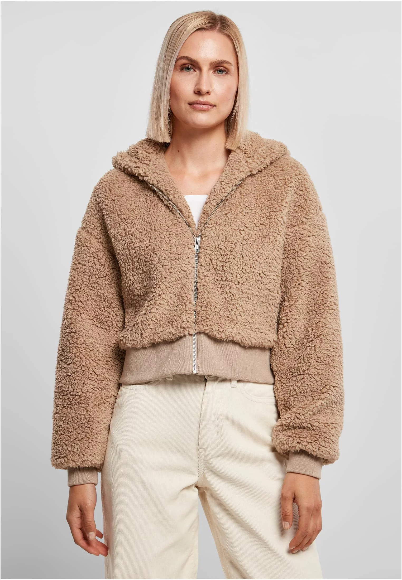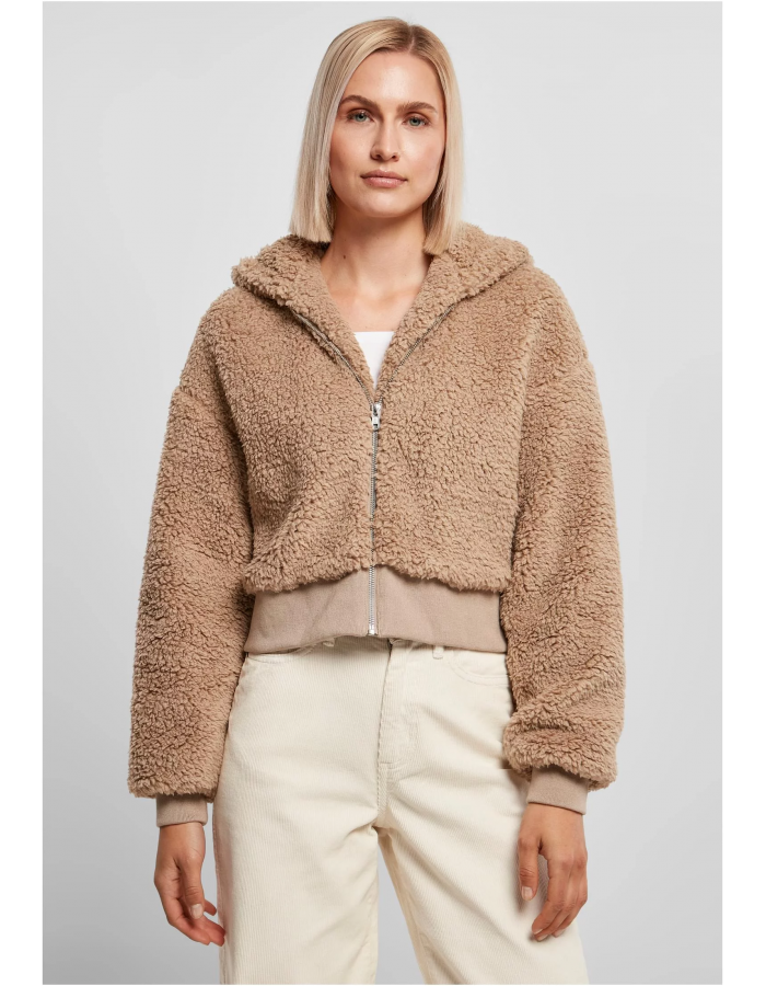 Tato dámská bunda kombinuje nadýchanou Sherpu s městským designem. Je krátkého střihu, ale oversized se spadlými rameny a velkou kapucí. Styl dámské bundy harmonicky dotvářejí široké elastické žebrované manžety na rukávech a spodním lemu. Zapíná se na centrální kovový zip.
