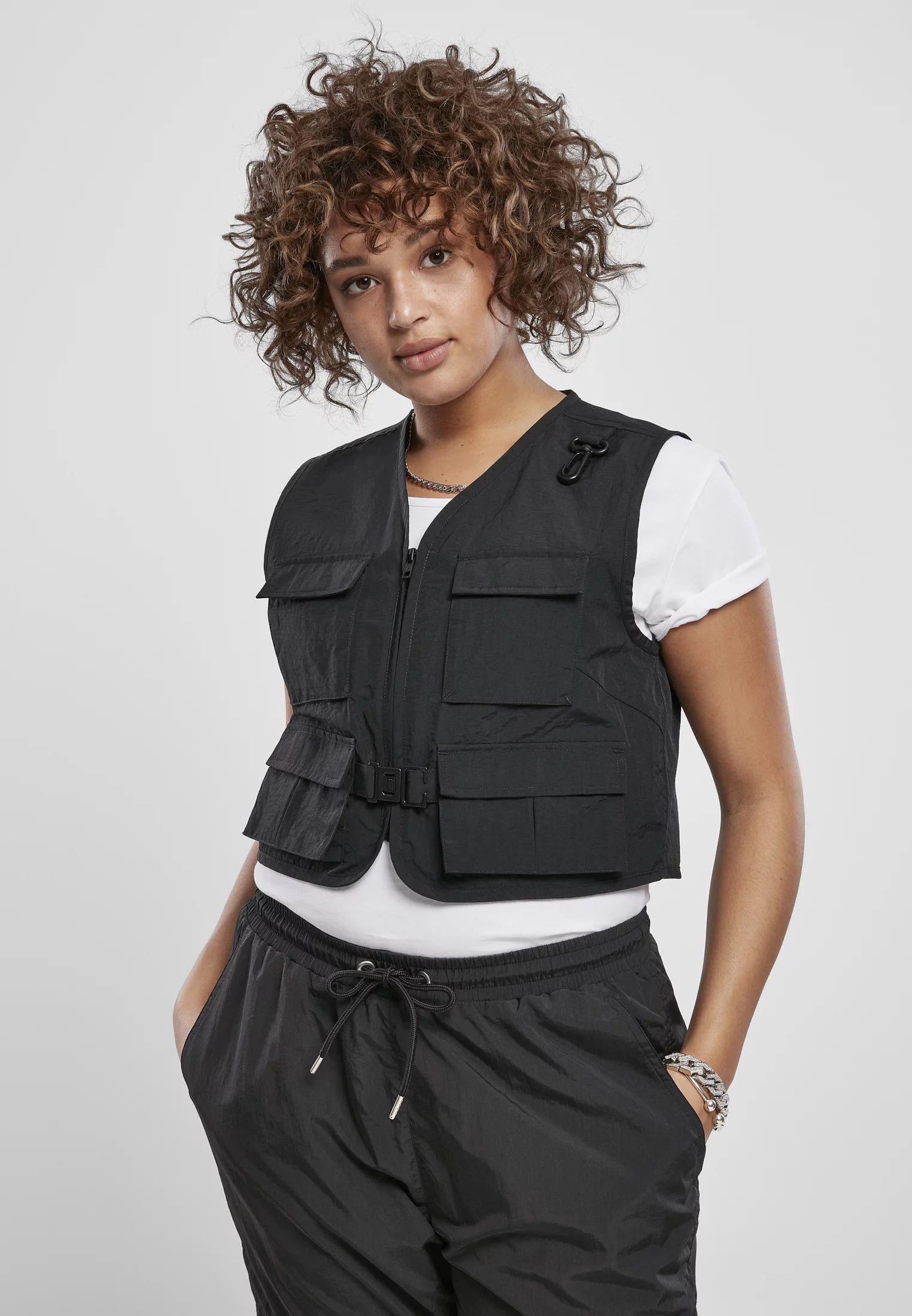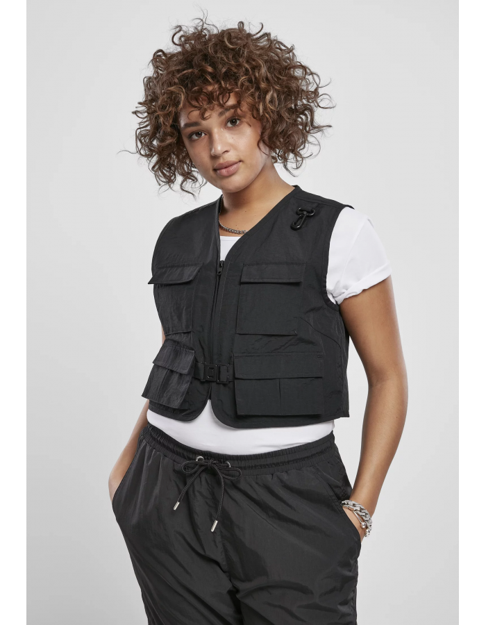 Dámská vesta dělá funkční a stylový vzhled. Je zkrácena a zapíná se na krátký zip a karabinu. Na přední straně jsou uspořádány čtyři měchové kapsy. Díky integrované karabině na levém rameni je design vesty dokonale zaoblen. Má pravidelný střih a je vyrobena z robustního nylonu a zvlněného talonu. Uvnitř je podšitá lehkou síťovinou.