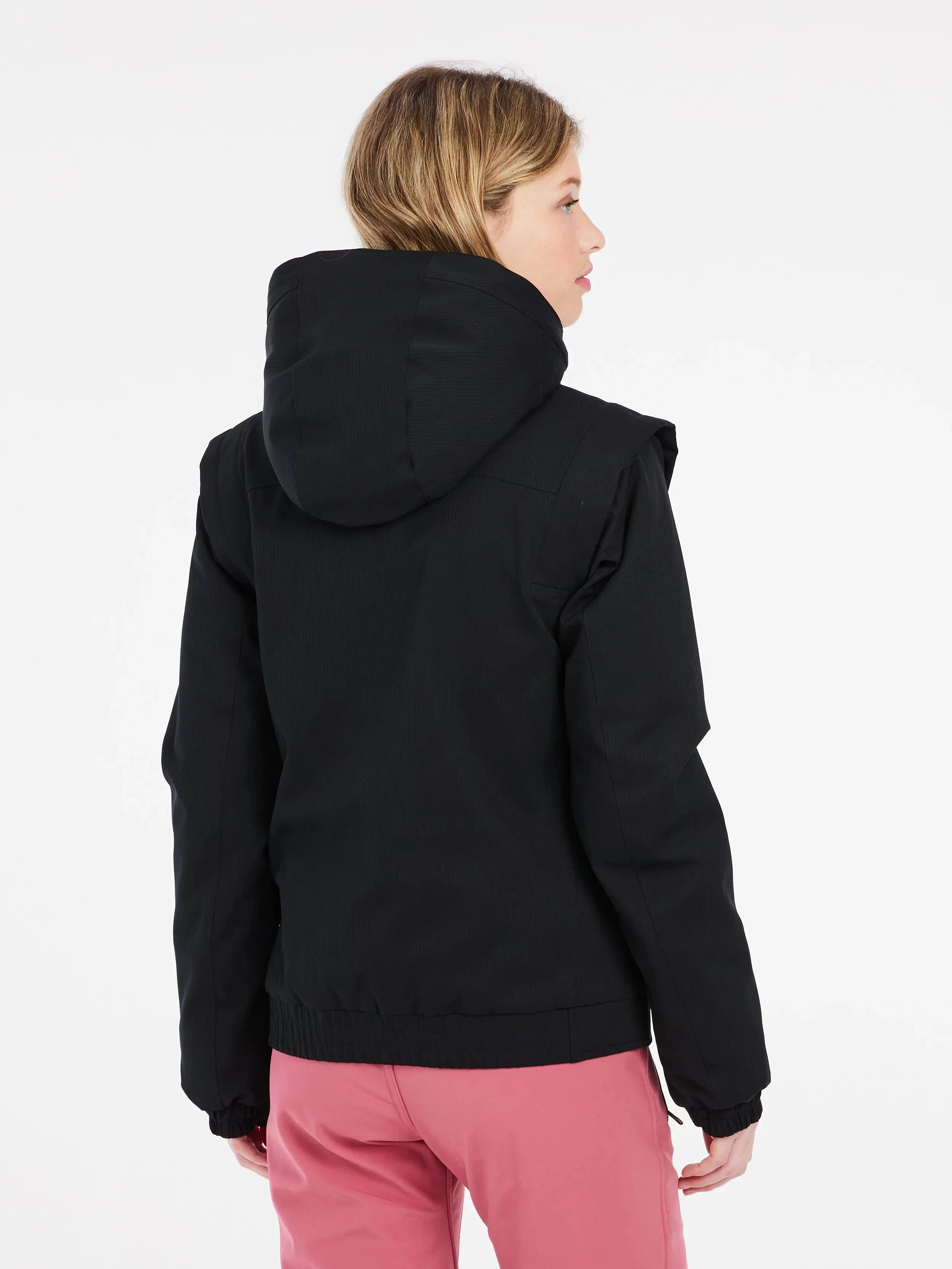 Jednoduchý jednobarevný design zahrnuje skrytý klopu a ramenní klapky, které dodávají bundě PRTEASY šmrnc a eleganci.