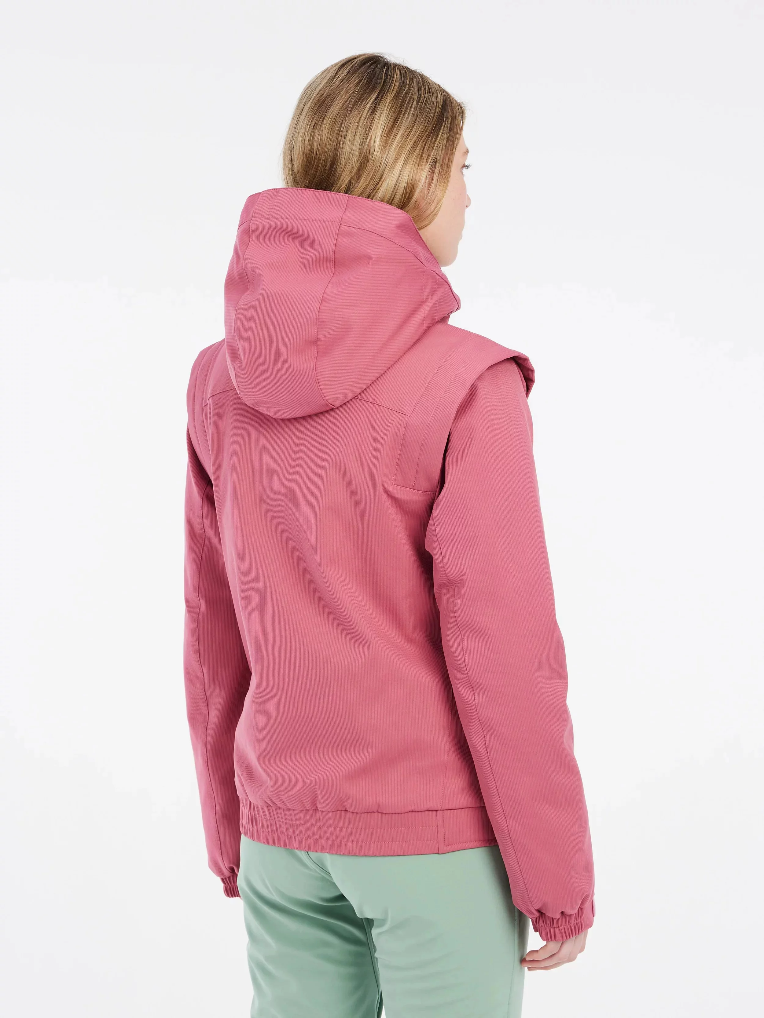 Jednoduchý jednobarevný design zahrnuje skrytý klopu a ramenní klapky, které dodávají bundě PRTEASY šmrnc a eleganci.