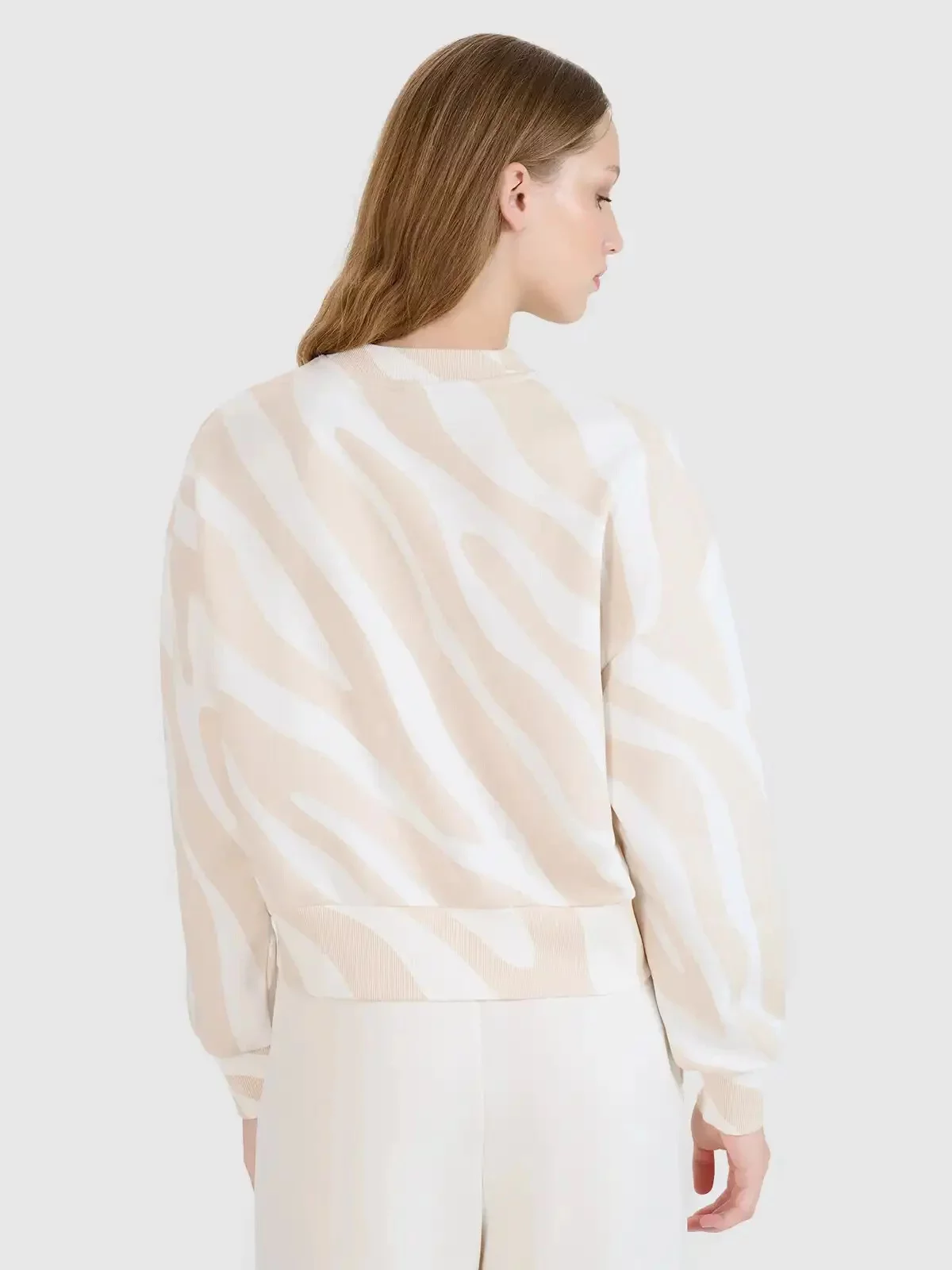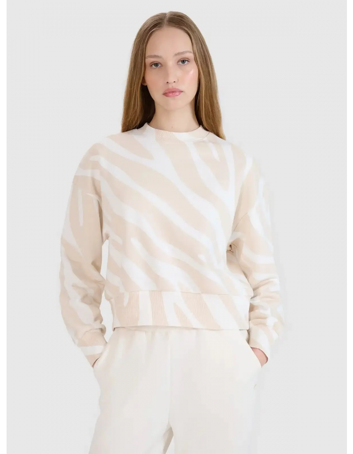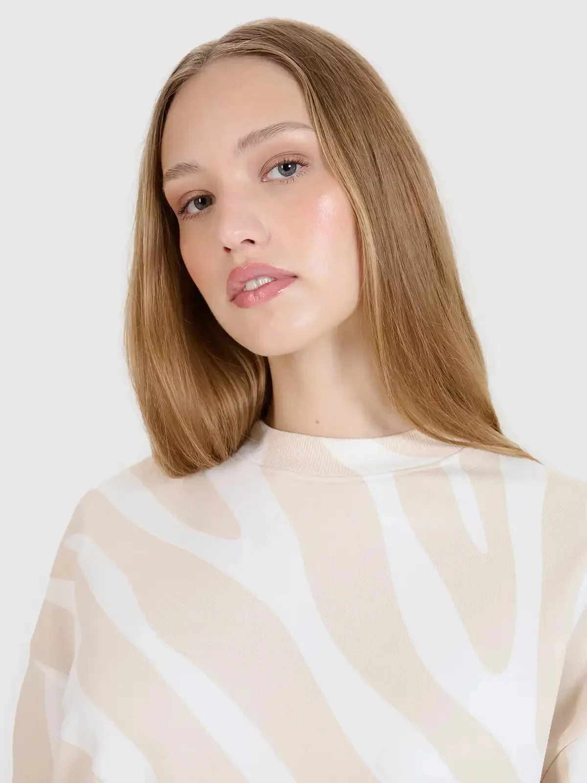 Má volnější střih s dropped shoulder rukávy, kulatým výstřihem a širokými žebrovanými manžetami na rukávech a spodním lemu.