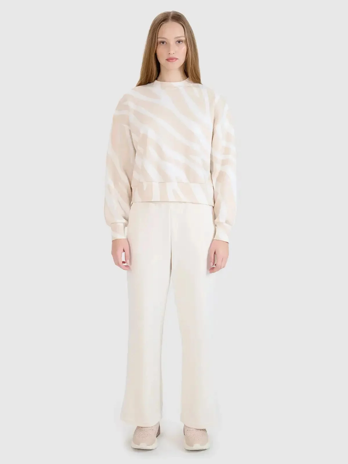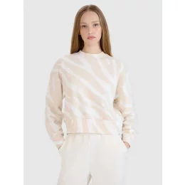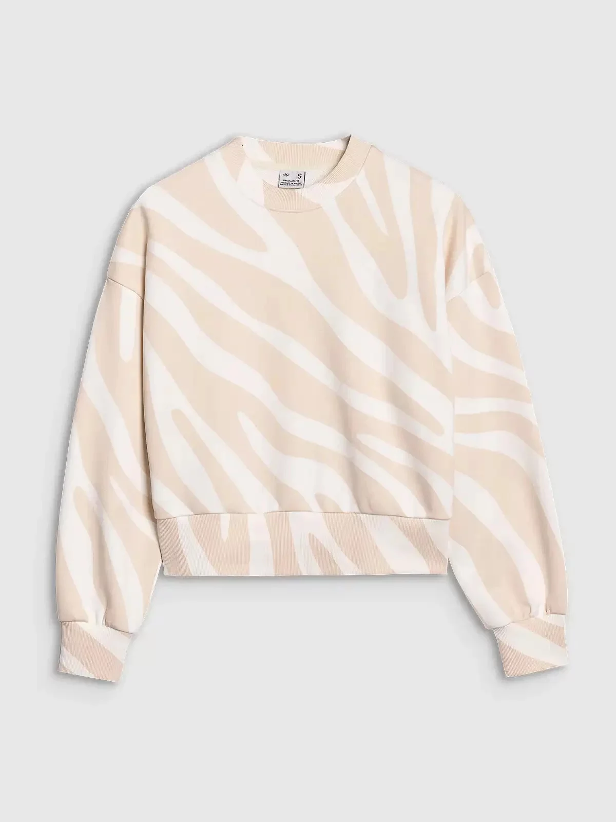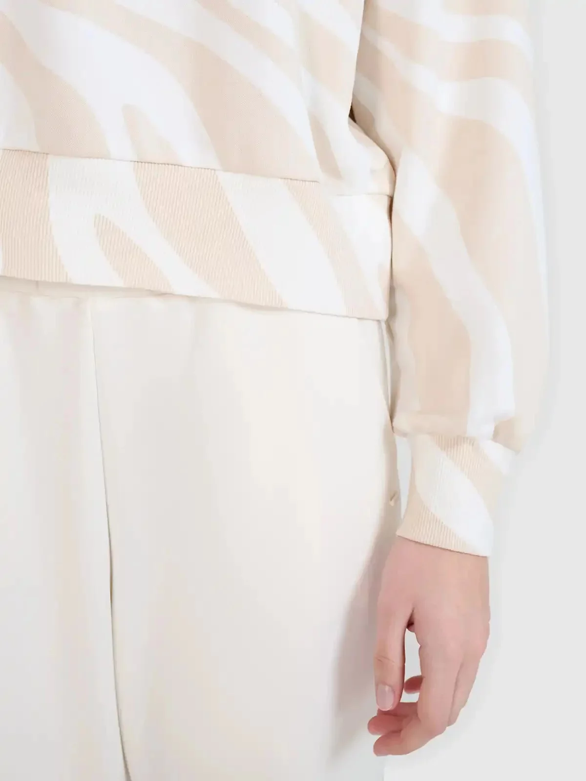 Má volnější střih s dropped shoulder rukávy, kulatým výstřihem a širokými žebrovanými manžetami na rukávech a spodním lemu.
