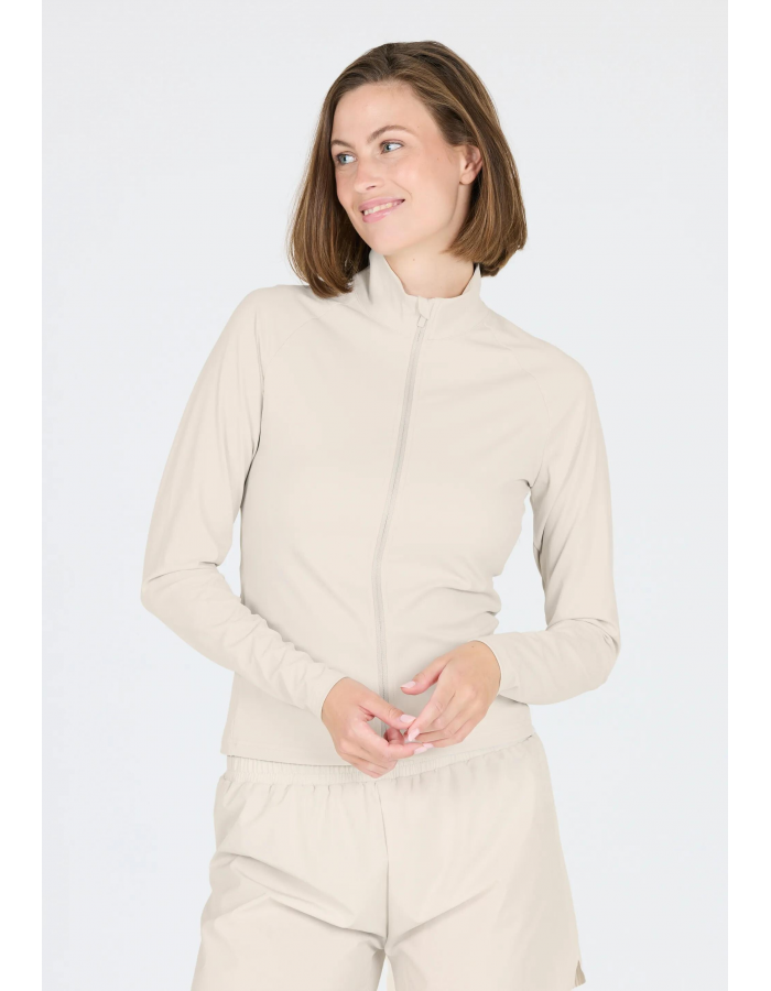Díky zapínání na celý zip se snadno obléká i svléká. Stojáček chrání krk před větrem a mírným chladem, a raglánové rukávy neomezují v pohybu.