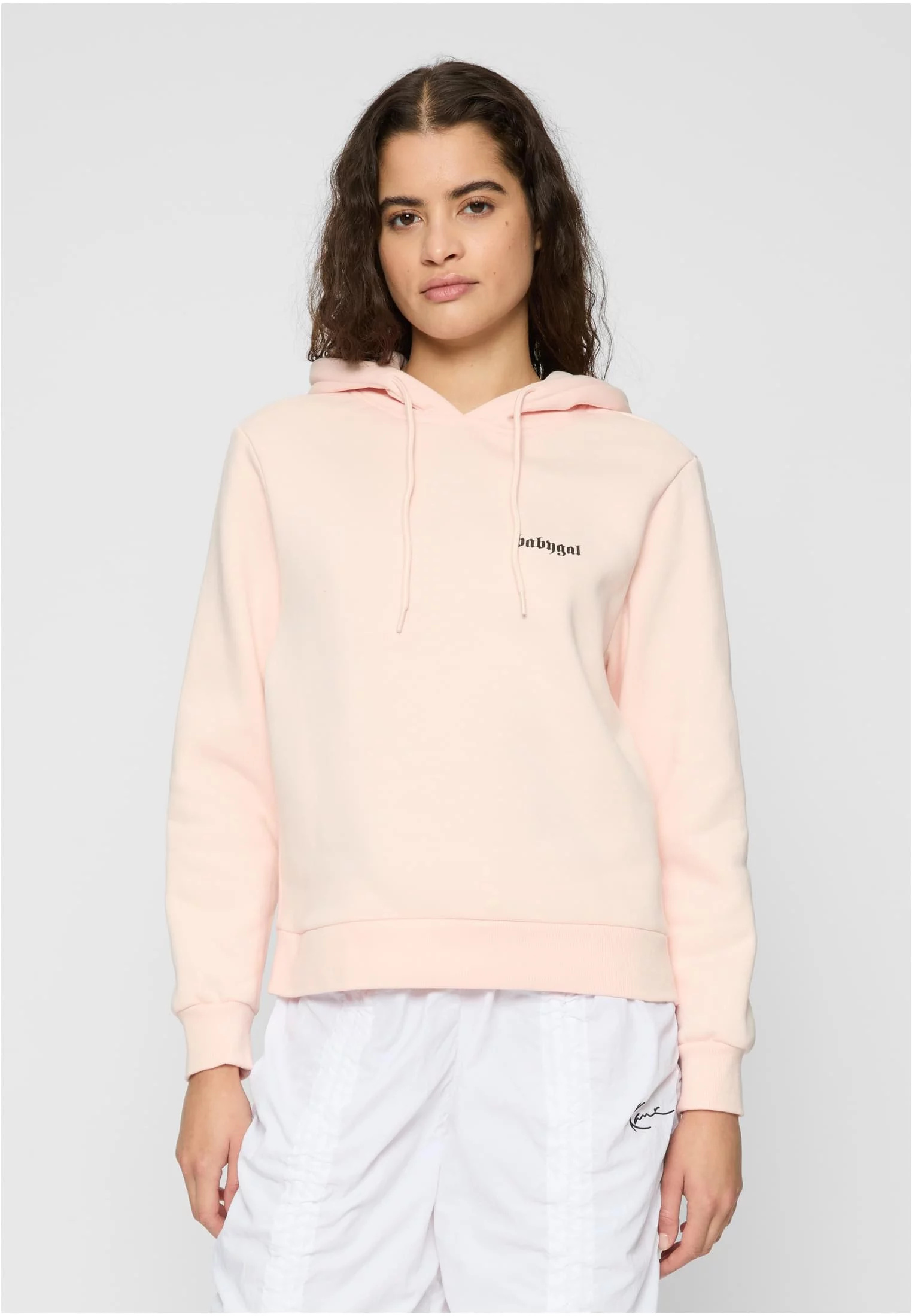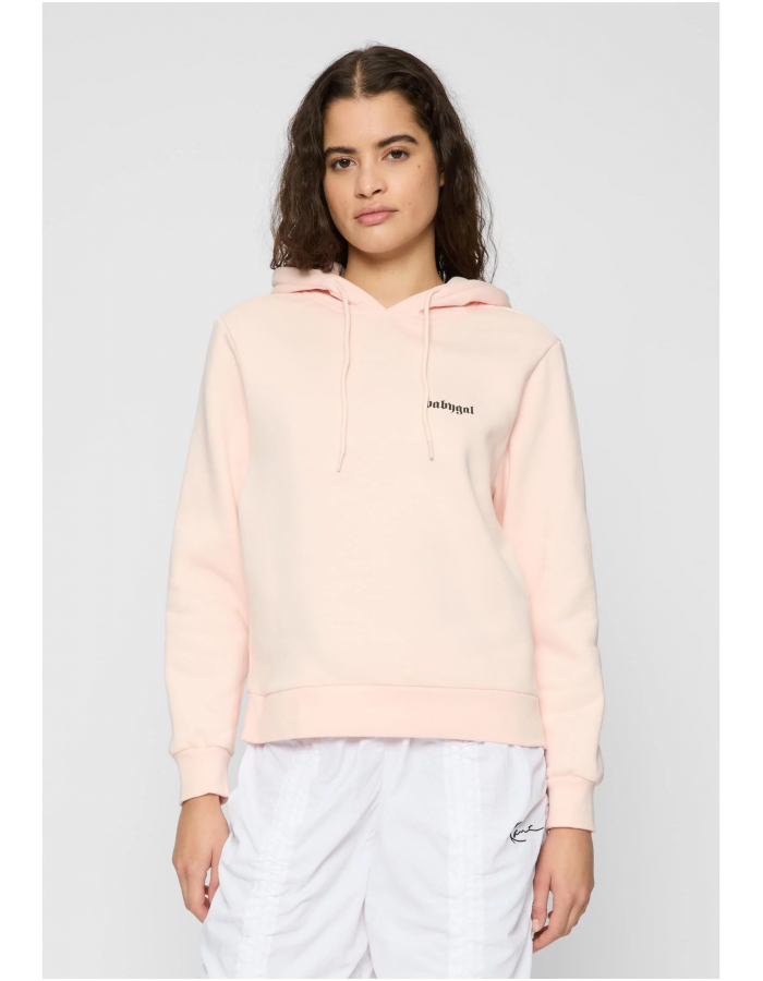 Mikina má jednoduchý design s malým černým nápisem "babygal" na levé straně hrudi a velký potisk na zádech. Kapuce je vybavena stahovacími šňůrkami a mikina má klasický střih s dlouhými rukávy a žebrovanými manžetami a spodním lemem. Tento kousek působí velmi pohodlně a ležérně, ideální pro každodenní nošení nebo volný čas. Světle růžová barva dodává mikině jemný a ženský vzhled, který je snadno kombinovatelný s různými outfity.