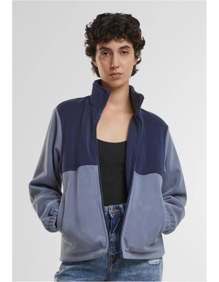 Fleecová mikina ve dvou odstínech modré barvy. Mikina má vysoký límec a zapínání na zip po celé délce. Horní část mikiny je v tmavší fialové, zatímco spodní a rukávy jsou ve světlejším odstínu. Tento volnější a pohodlný střih zajišťuje teplo a komfort, ideální pro chladnější dny. Mikina má také kapsy po stranách, což přidává na praktičnosti.