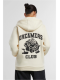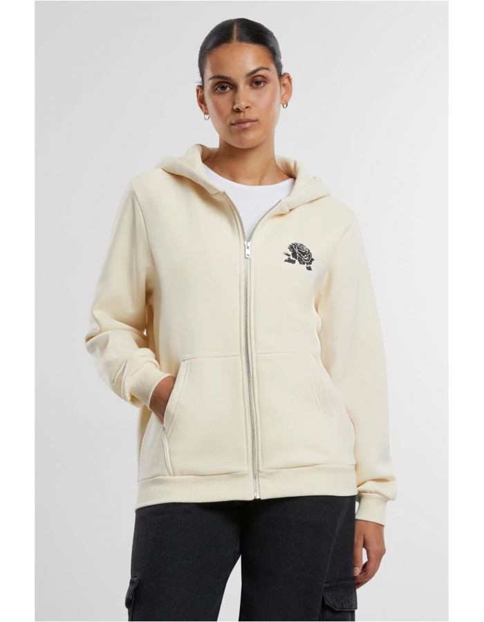 Na přední straně, vlevo na hrudi, je černý grafický motiv květiny. Zadní strana mikiny je zdobena velkým černým nápisem „Dreamers Club“ a pod ním je velký motiv růže. Mikina má volný střih, klokaní kapsy a je vyrobena z pohodlného materiálu, který je ideální pro chladnější dny nebo neformální nošení. Tento stylový design s květinovými prvky a silným nápisem je vhodný pro ty, kteří hledají výrazný, ale pohodlný kousek.