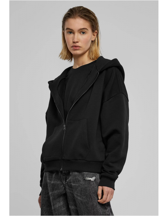 Dámská mikina s kapucí je stylový a pohodlný kousek oblečení. Tato mikina je černé barvy a vyznačuje se svým moderním, volným střihem ve stylu "boxy". Má praktickou kapuci se šňůrkami, která chrání před nepříznivým počasím a zip, který umožňuje snadné oblékání a svlékání.