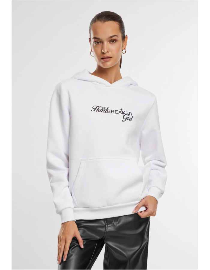Mikina je ve stylu "oversized" (volný střih), která je ideální pro pohodlné nošení. Na přední straně je černobílý nápis "The Heartbreaker Girl", zatímco na zadní straně se nachází velký nápis "The Heartbreaker Girl" doplněný růžovým srdcem a textem "She'll charm you with words." Design je stylizován do moderního, minimalistického vzhledu s důrazem na jednoduchost, která je obohacená o odvážný motiv na zadní straně. Mikina má klasickou přední kapsu a kapuci, což dodává na pohodlí a praktičnosti.