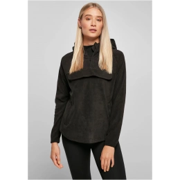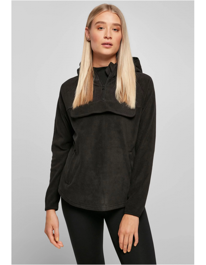 Tato dámská mikina s kapucí je hybridem mikiny s kapucí a stahovací bundy. Kapuce má zip na klopě a chránič brady. Zespodu se přes hrudník táhne jednoduchá chlopeň. Dále je svetr vybaven dlouhými rukávy a dvěma bočními kapsami na zip. Přední a zadní část nabízí velkoryse zaoblené spodní lemy, přičemž zadní část spadá přes spodní část, aby byla v teple. Střih s raglánovými rukávy a použitím hladkého mikrofleece materiálu je zajištěn optimální komfort nošení. Úzká páska na manžetách rukávů a kapuci doplňuje styl. Dámská mikina s kapucí je regular fit.