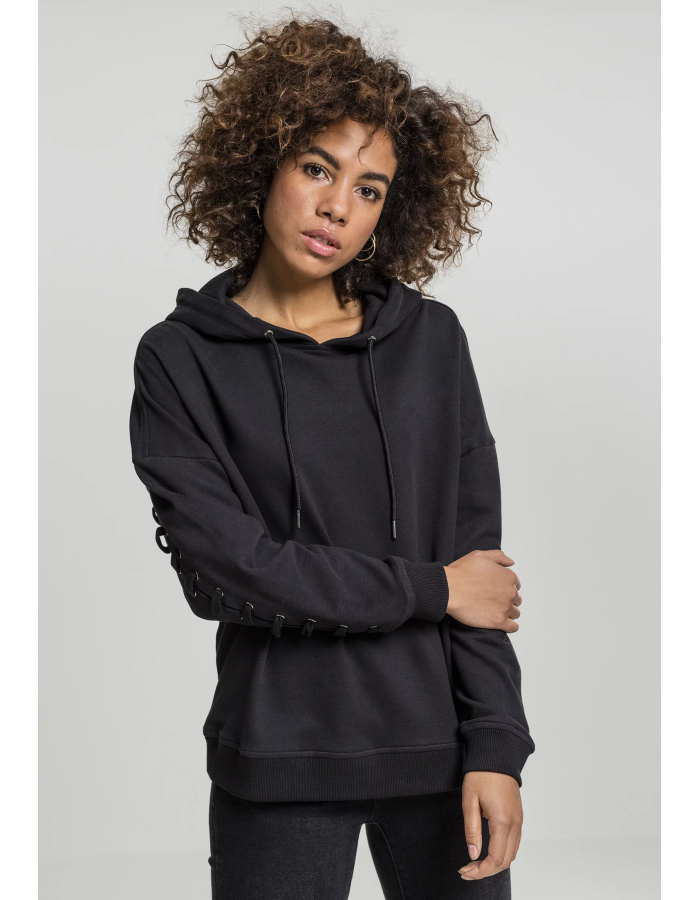 Streetwear vepředu, rocker vzadu: Dámská šněrovaná mikina s mírně oversized střihem a krátkým střihem je cool a ležérní. Zadní část dodává nádech překvapení – nápadné šněrování s kovovými očky se táhne od paže k paži přes záda, čímž se na obou stranách.