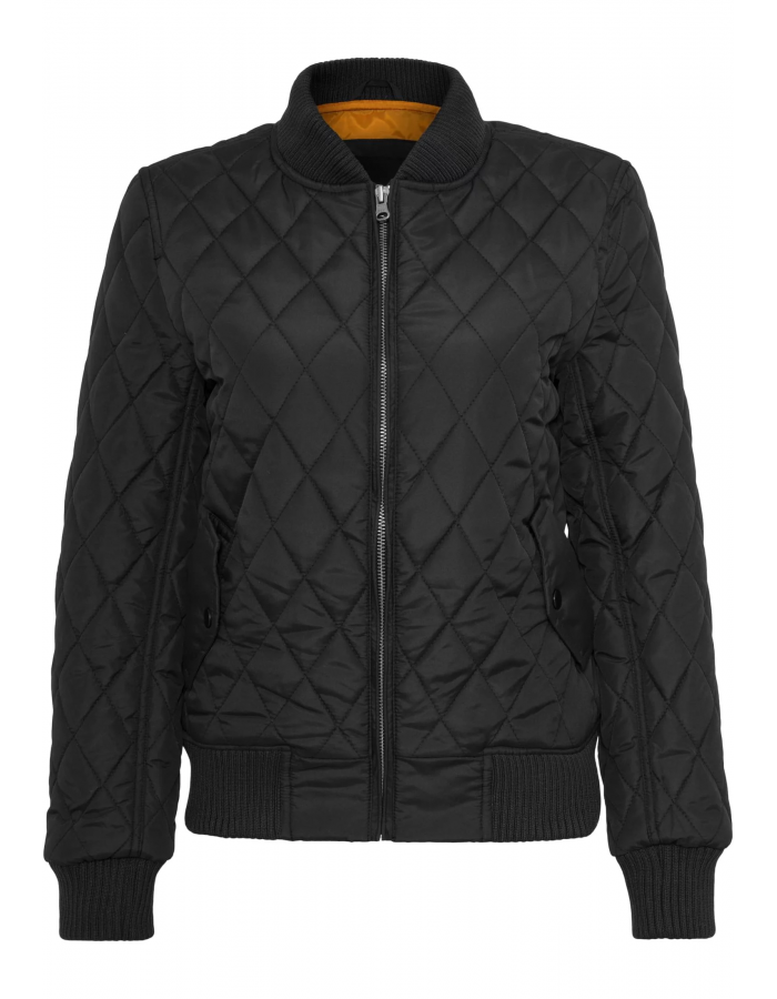 Dámská nylonová bunda Diamond Quilt od Urban Classics boduje svým žebrovaným výstřihem a otvorem na rukávech a lemu. Vnitřní podšívka je držena v oranžové barvě a na přední straně je vpravo a vlevo kapsa.