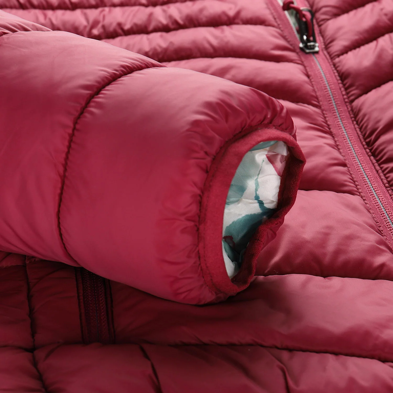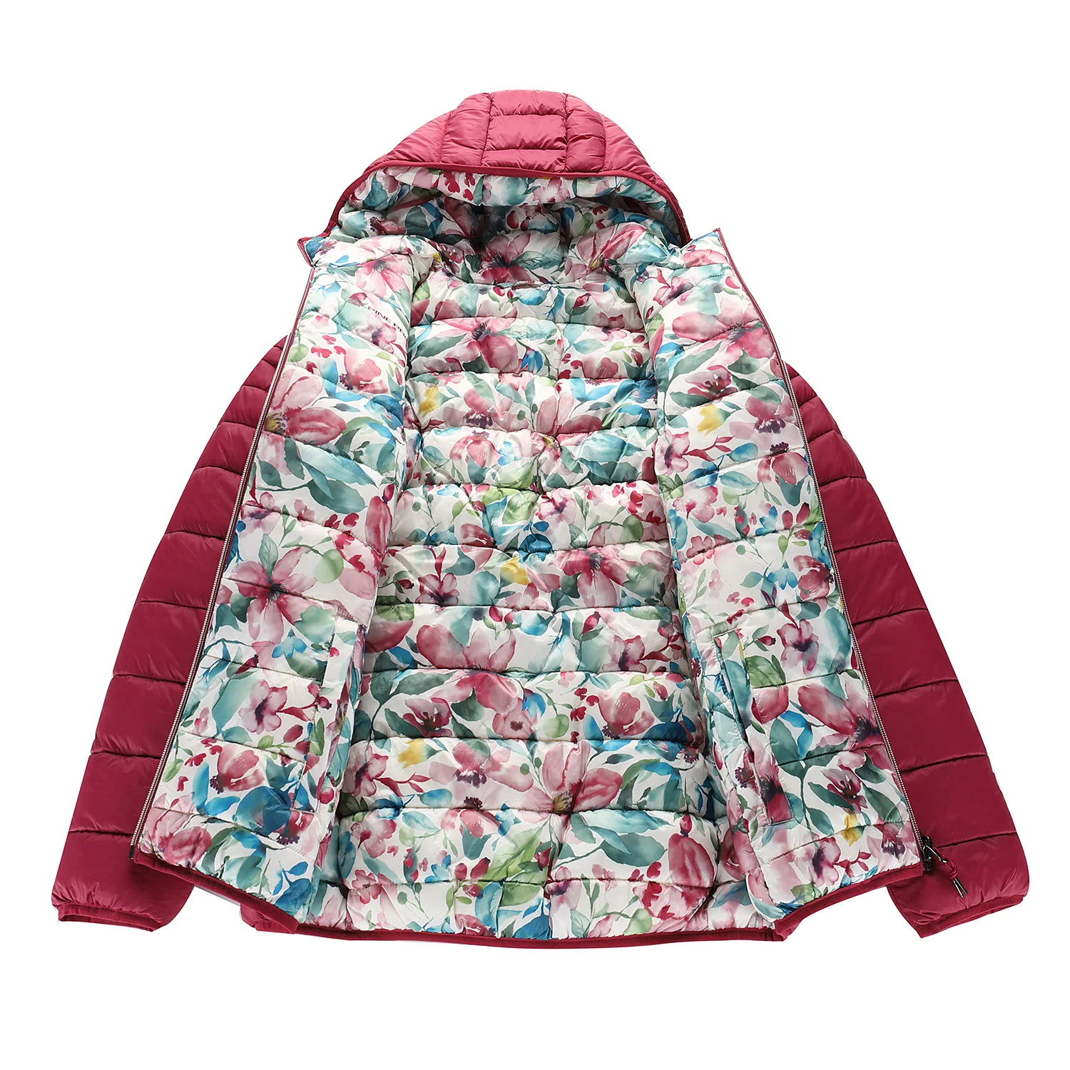 Dámská zimní bunda EROMA je vyrobena z vodoodpudivého, větruodolného, ultralehkého a krásně celopotištěného materiálu se zátěrem a funkční úpravou Teflon EcoElite™. Tato úprava navíc neobsahuje fluorocarbony, a je tak příznivá k životnímu prostředí. Má silnou hřejivou výplň, kontrastní prošívanou podšívku, kapuci, rukávy a spodní část lemované gumou, krytku brady, 4 praktické kapsy se zipy a delší taháčky pro snadnou manipulaci. Bunda je plnohodnotně oboustranná. Složení materiálu: 100% nylon.