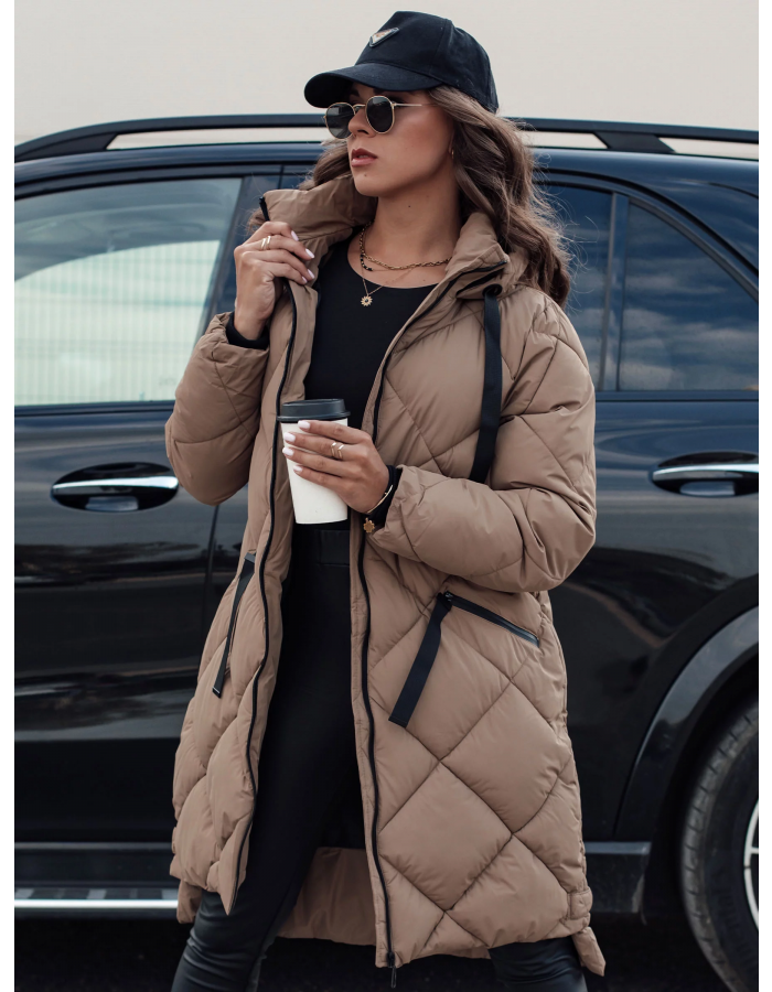 Jedinečný charakter dodávají zajímavé prošívání a černé prvky, jako je výplň kapuce, zip a stuhy u kapuce a kapes, které také tvoří ozdobný prvek. Ideálně doplní mnoho stylizací.
