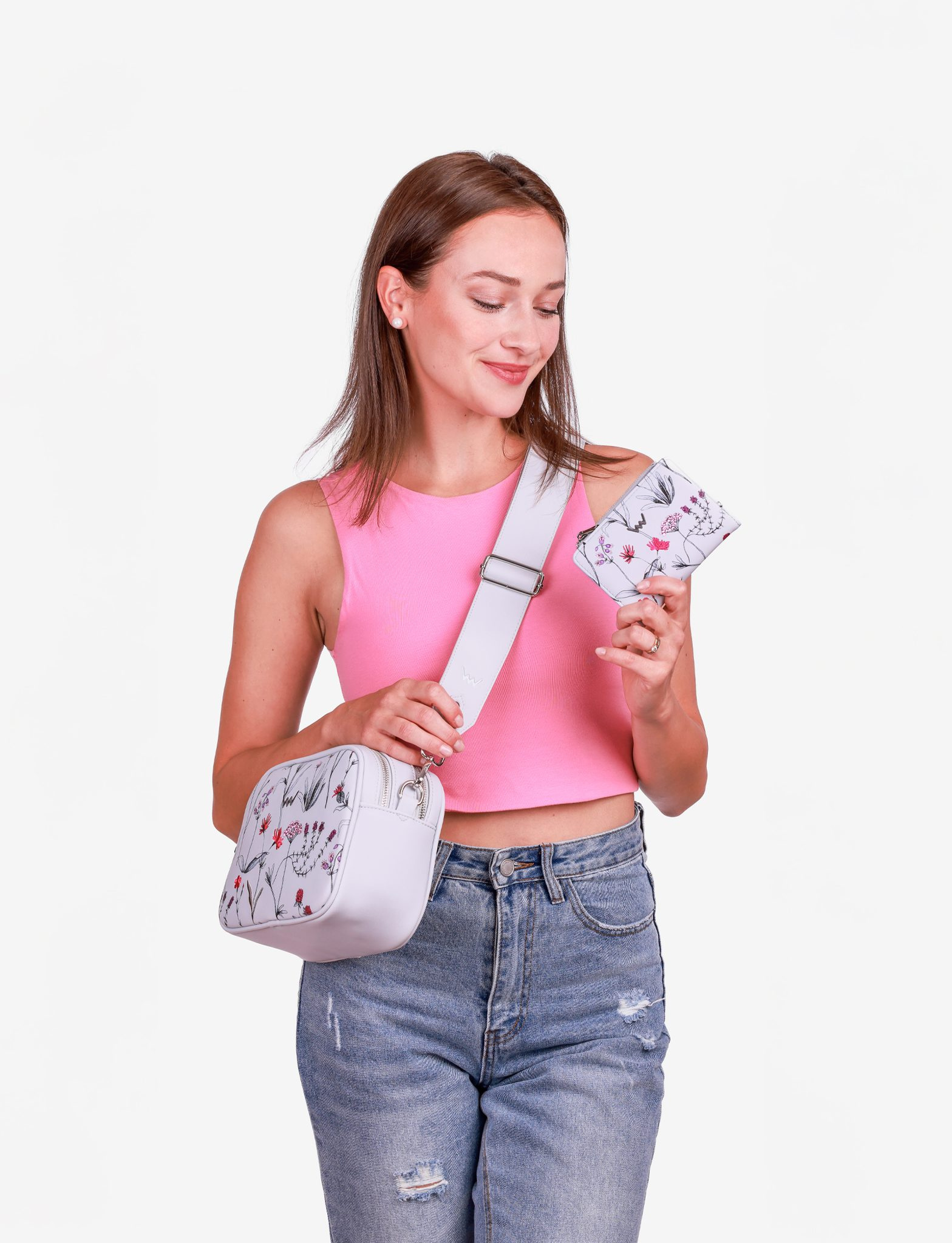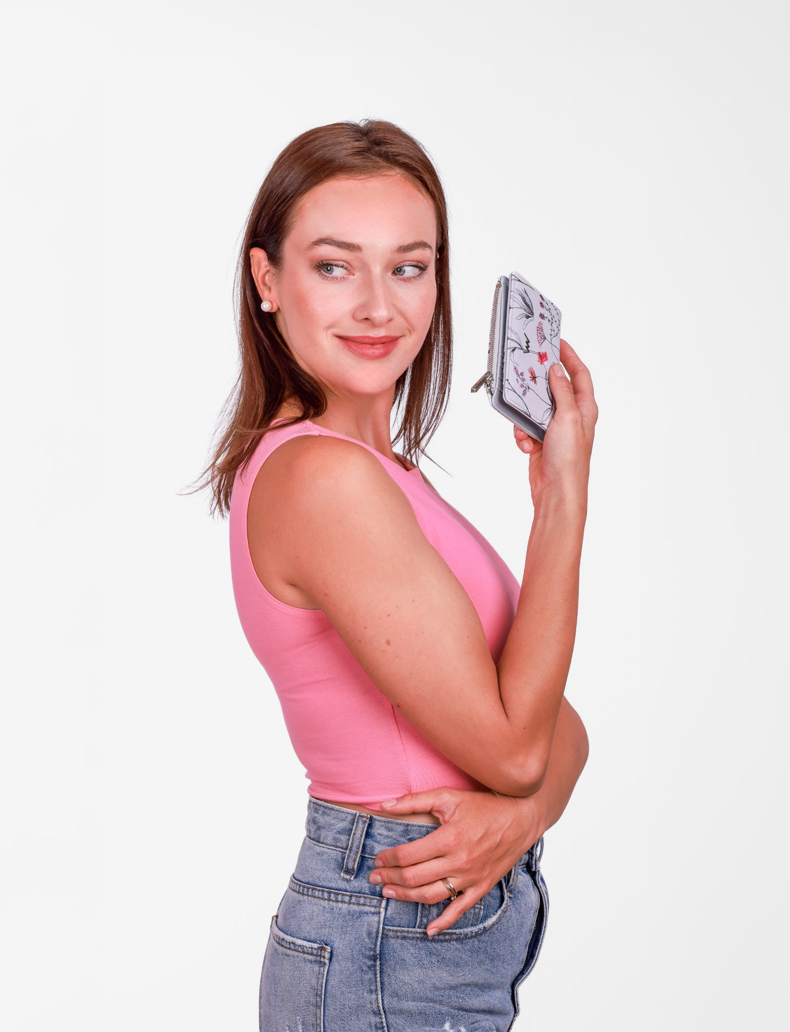 Mini peněženka s romantickou duší. Jemné květinové zdobení od grafičky Hany Kořánové jí dodává kouzlo, které zaujme i bez zbytečných slov. Je malá, ale zvládne pojmout všechno, co potřebuješ na lehký den nebo večer ven. Když chceš něžný detail, co zvedne náladu i outfit.
