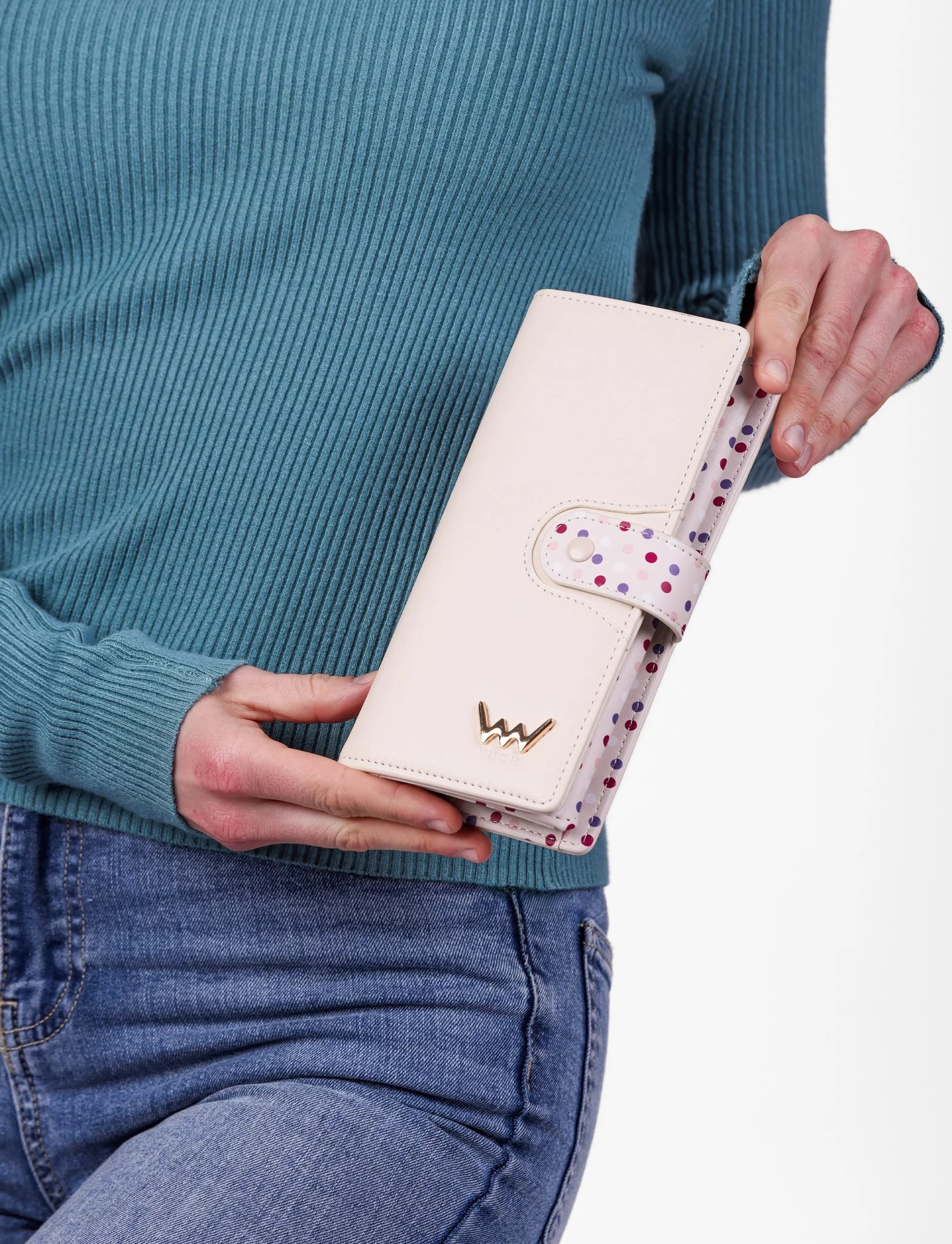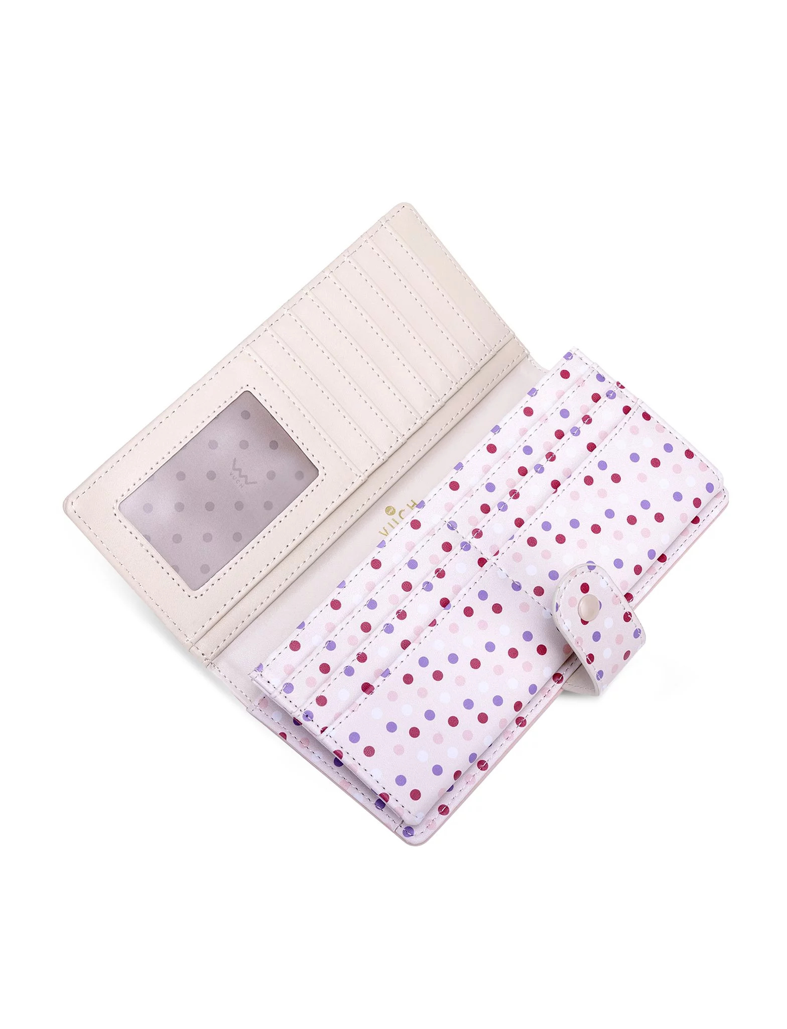 Oblíbená puntíkatá peněženka se vrací v novém, vyladěném kabátku. Světlá klopa, zlaté kování a kovové logo s jemným textem jí dodávají elegantní nádech, který si zamiluješ na první pohled. Uvnitř Tě potěší vylepšený prostor a nový jemný rastr puntíků, který dodává moderní a promyšlený styl.