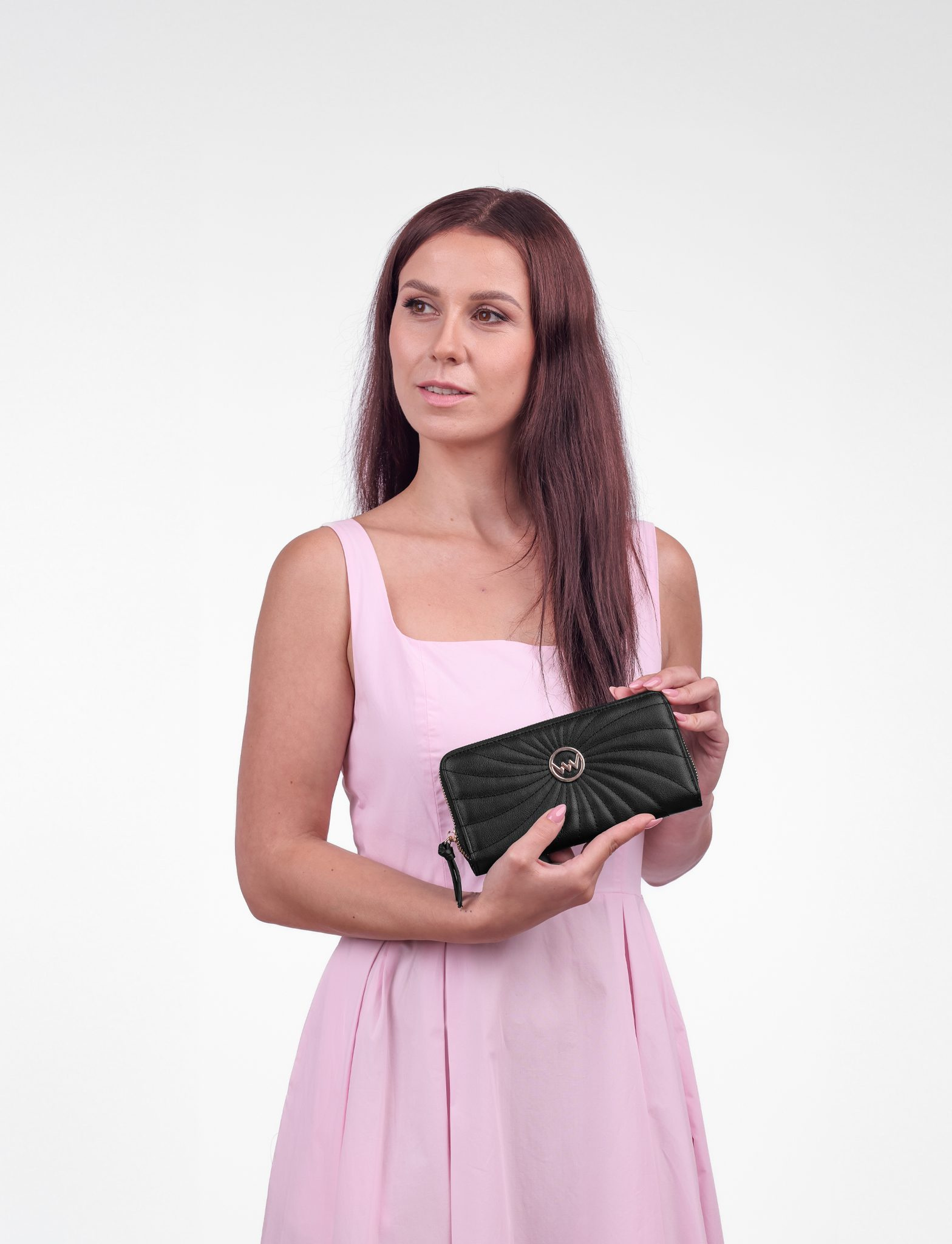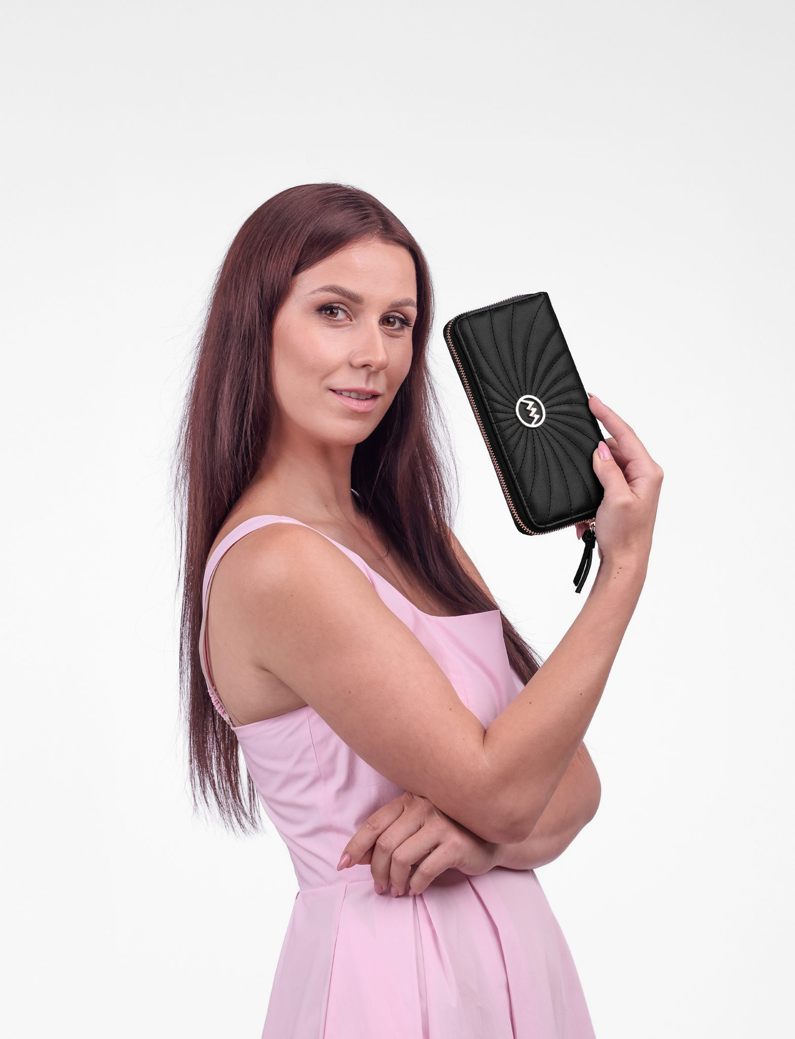 Zipová peněženka, která má styl pěkně pod palcem. Přední stranu zdobí jemné prošití ve tvaru paprsků, které chytne oko, ale neruší. Uvnitř schová všechny Tvoje karty, bankovky i mince, takže máš všechno pěkně pohromadě. Malý detail, velký efekt – přesně tak, jak to máme rádi.
