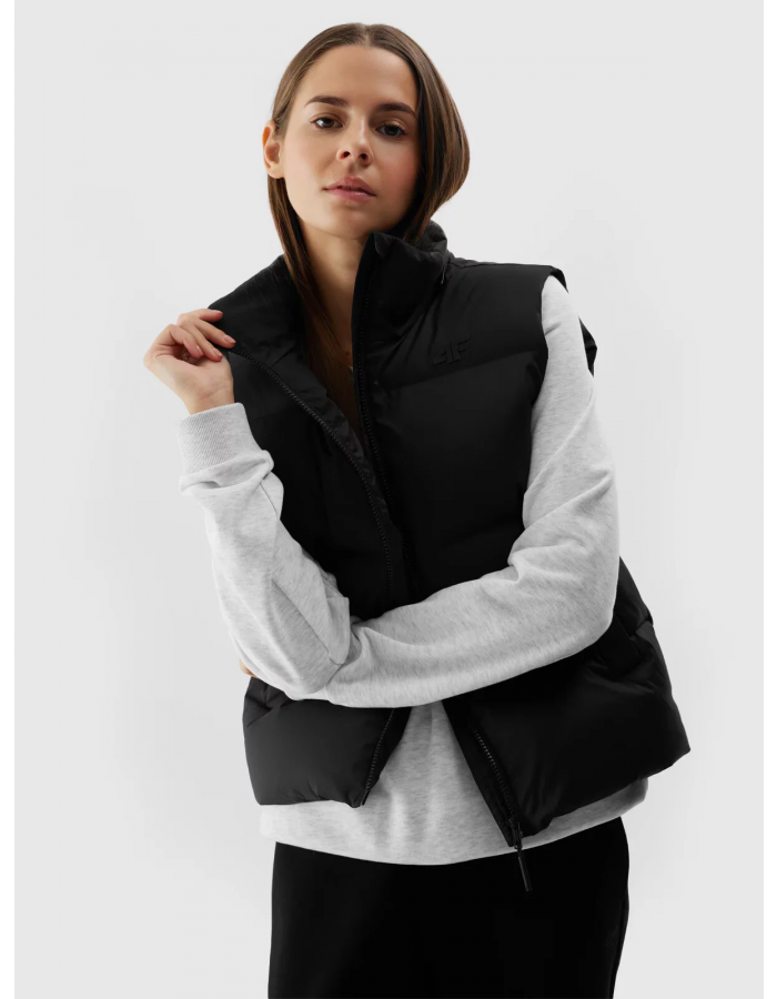 Dámská krátká péřová vesta se zvýšeným objemem a hmotností výplně je ideální volbou pro chladné a zimní dny při každodenních nebo sportovních aktivitách.