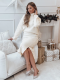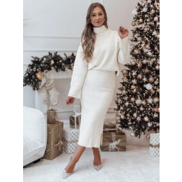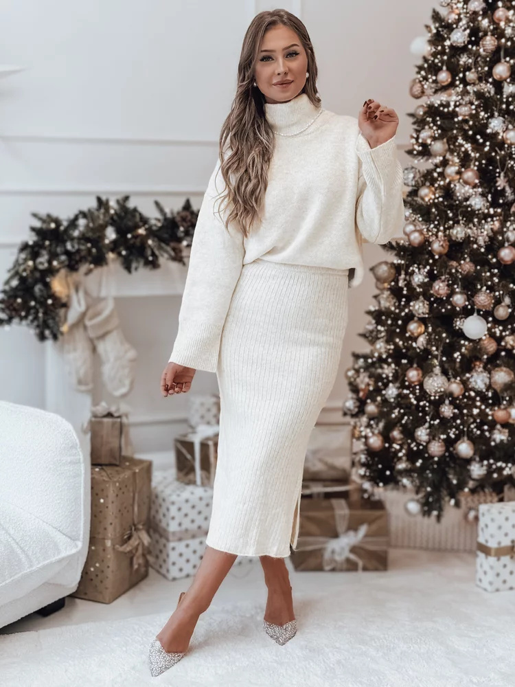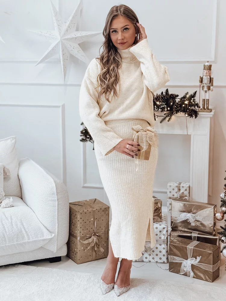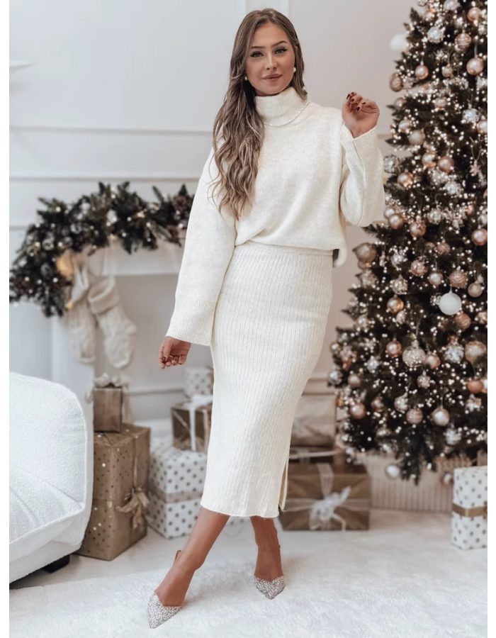 Sada, která spojuje pohodlí a styl, je ideální pro chladné zimní dny. Měkká, pletená struktura materiálu způsobuje, že celek obepíná pokožku, zajišťuje nejen pohodlí, ale i elegantní vzhled. Golf s volnějším střihem dodává charakter, zatímco sukně s jemným rozparkem nenápadně odhaluje nohy, čímž přináší jemný nádech ženskosti. Ideální na setkání s rodinou, sváteční večery nebo výlety do města.
