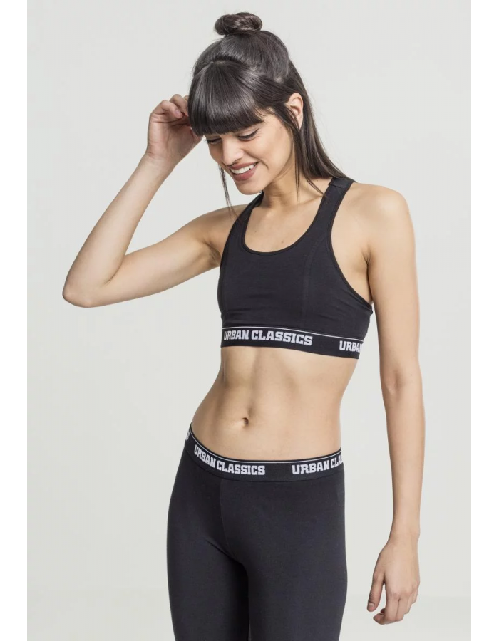 Celou cestu nebo vůbec! Dámská podprsenka s logem Urban Classics s nápadným nápisem značky na elastickém lemu pod prsy a střihem nad ramena na zádech poskytují sportovní vzhled. Široká ramínka a měkký bavlněný materiál se strečovým obsahem slibují dobrý střih a pohodlné nošení. Jednoduše skvělý kousek na léto!