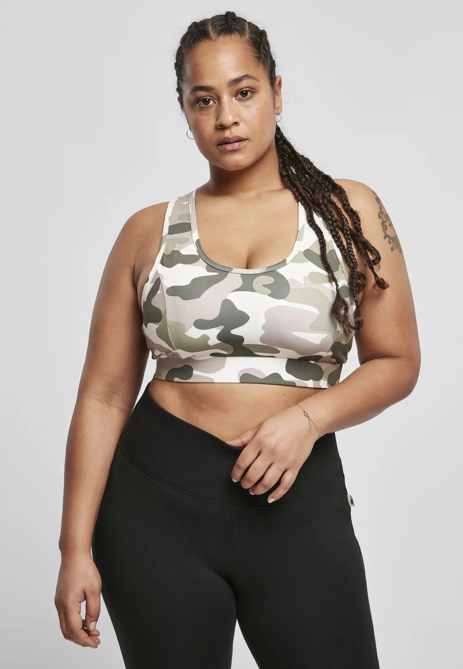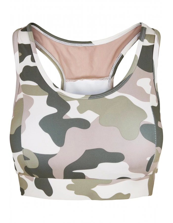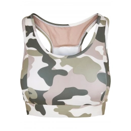 Tato dámská sportovní podprsenka nabízí vzrušující vzhled v kombinaci s perfektním střihem. Díky zádům typu racer s chytrou síťovanou vsadkou zůstávají záda volná, zatímco přední charakterizuje kulatý dekolt. Sportovní styl podprsenky Urban Classics završuje trendy camo vzor. Vynikající pohodlí při nošení zajišťuje přiléhavý slim střih, všité košíčky a gumička uvnitř spodního lemu.