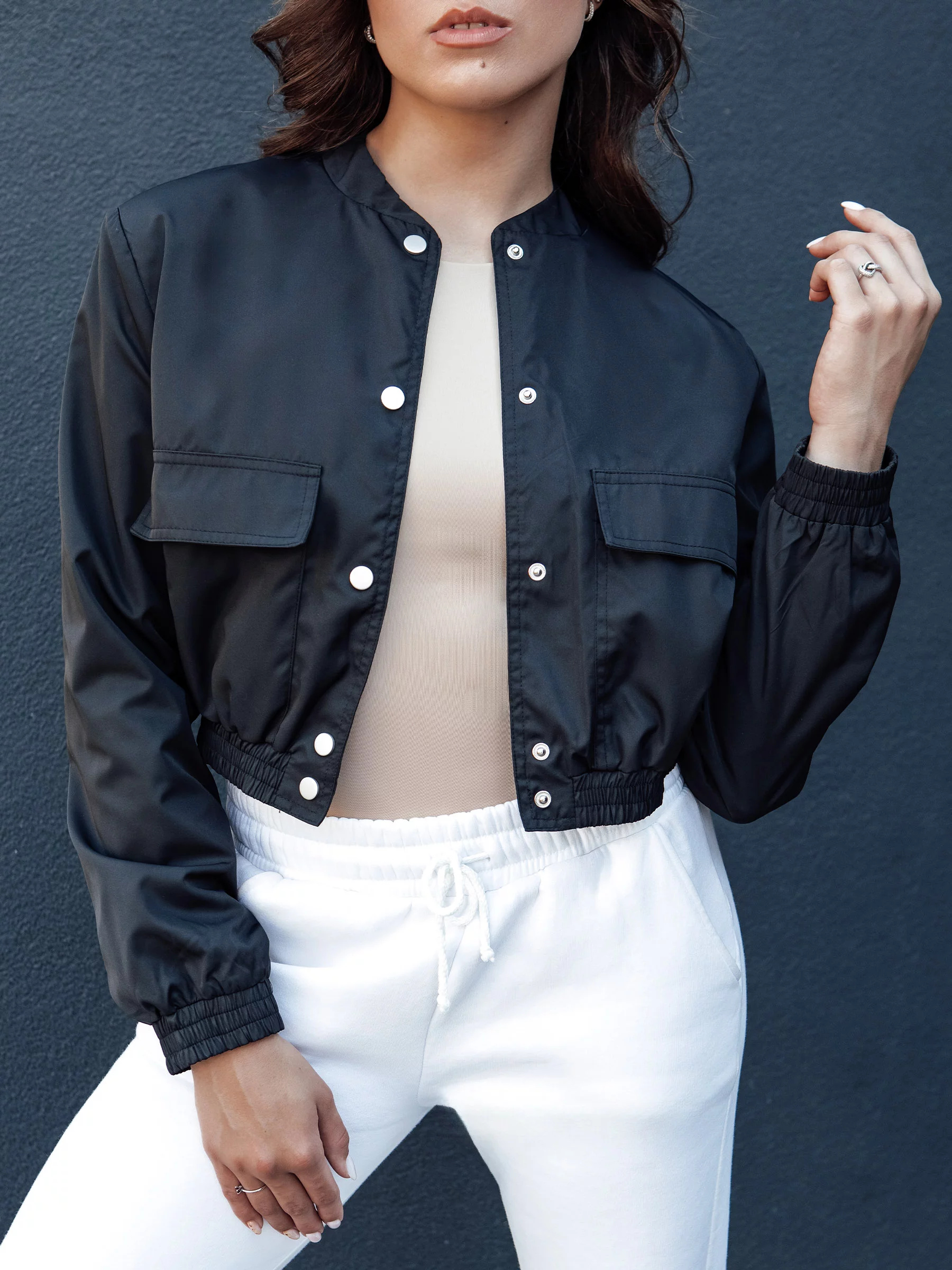 Objevte krátkou přechodovou bundu, která spojuje funkčnost s městským šarmem. Vybavená velkými, praktickými kapsami a pohodlnými manžetami na spodním lemu a rukávech, stane se tvým spolehlivým společníkem na jarní dny. Ideální jako prvek každodenního městského vzhledu, tato bunda ti nejen poskytne pohodlí, ale také dodá styl každému tvému outfitu.