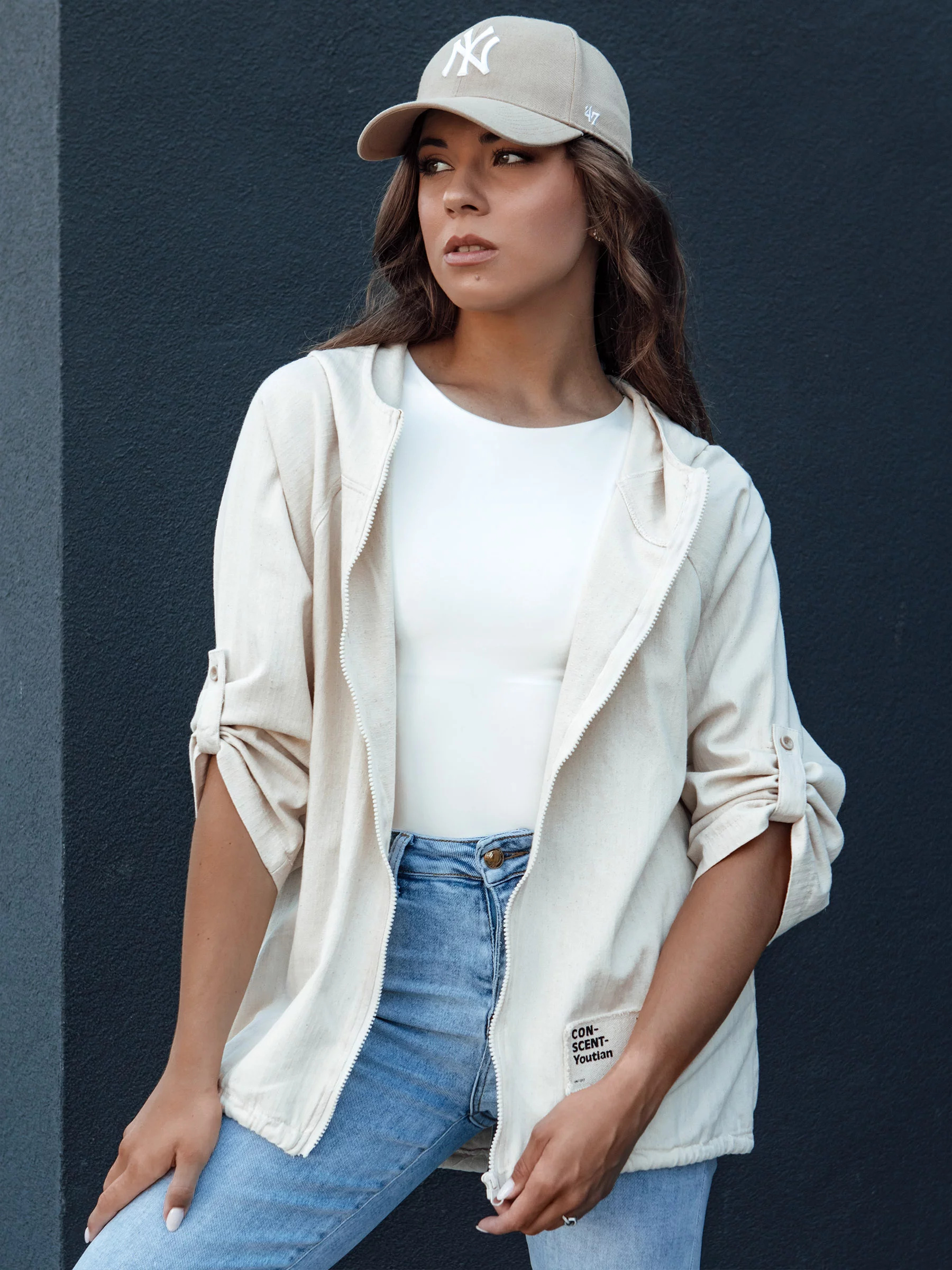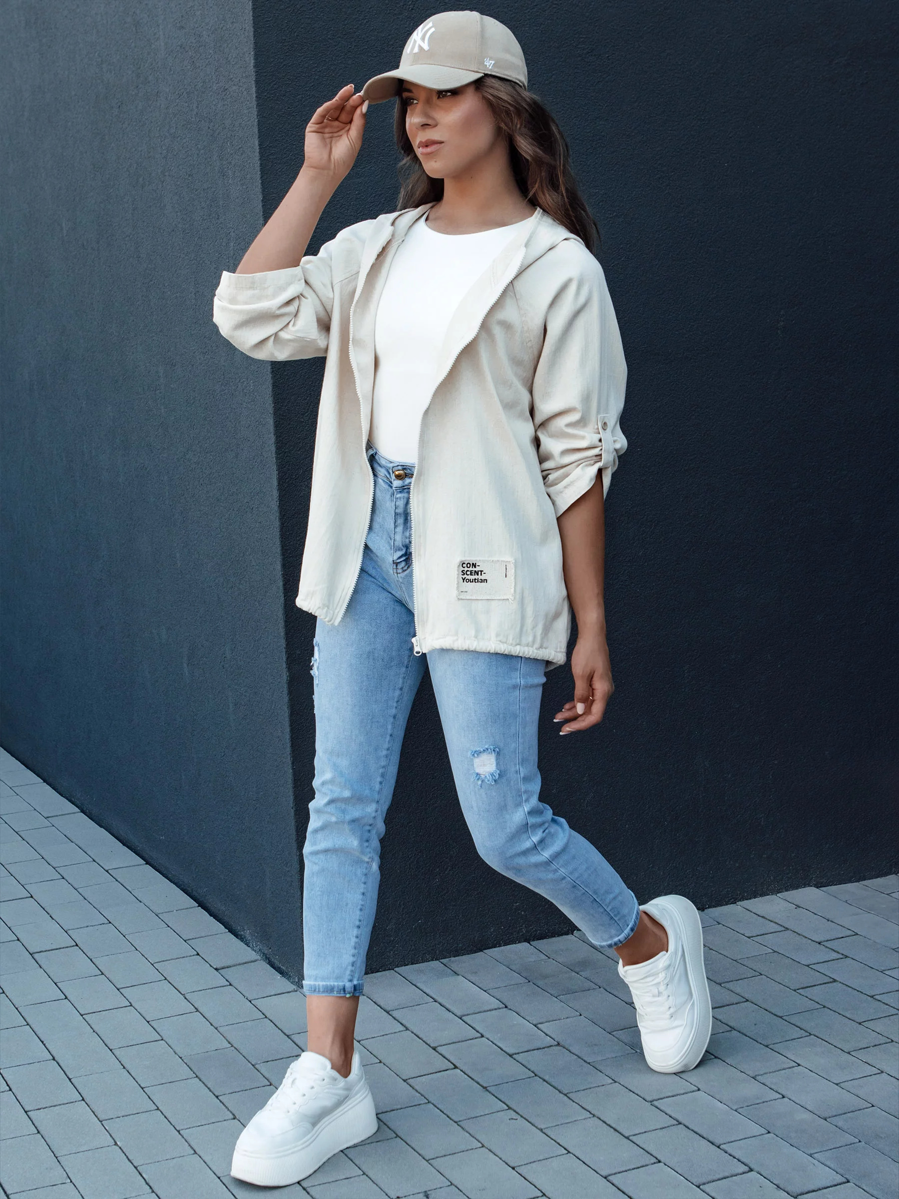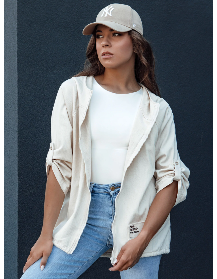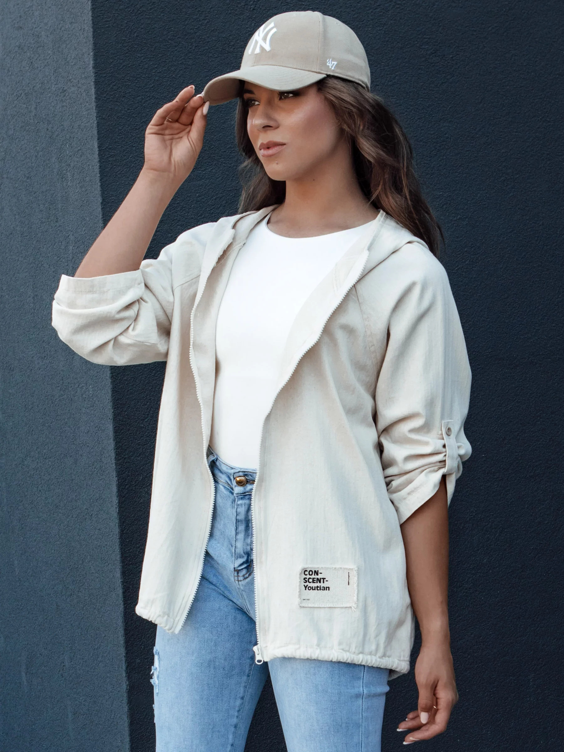 Bunda MANDIA je kombinací lehkosti a stylu, ideální pro ženy, které si cení módního vzhledu a pohodlí. Jeho volný střih zajišťuje plnou volnost pohybu a praktická kapuce účinně chrání před jarními rozmary počasí. Bunda zapínaná na zip, navíc ozdobená stylovou nášivkou, je návrh, který spojuje funkčnost s módním designem. Rukávy 3/4, s možností připnutí, se skvěle hodí do teplejších dnů, umožňují přizpůsobit vzhled individuálním preferencím a stylu.