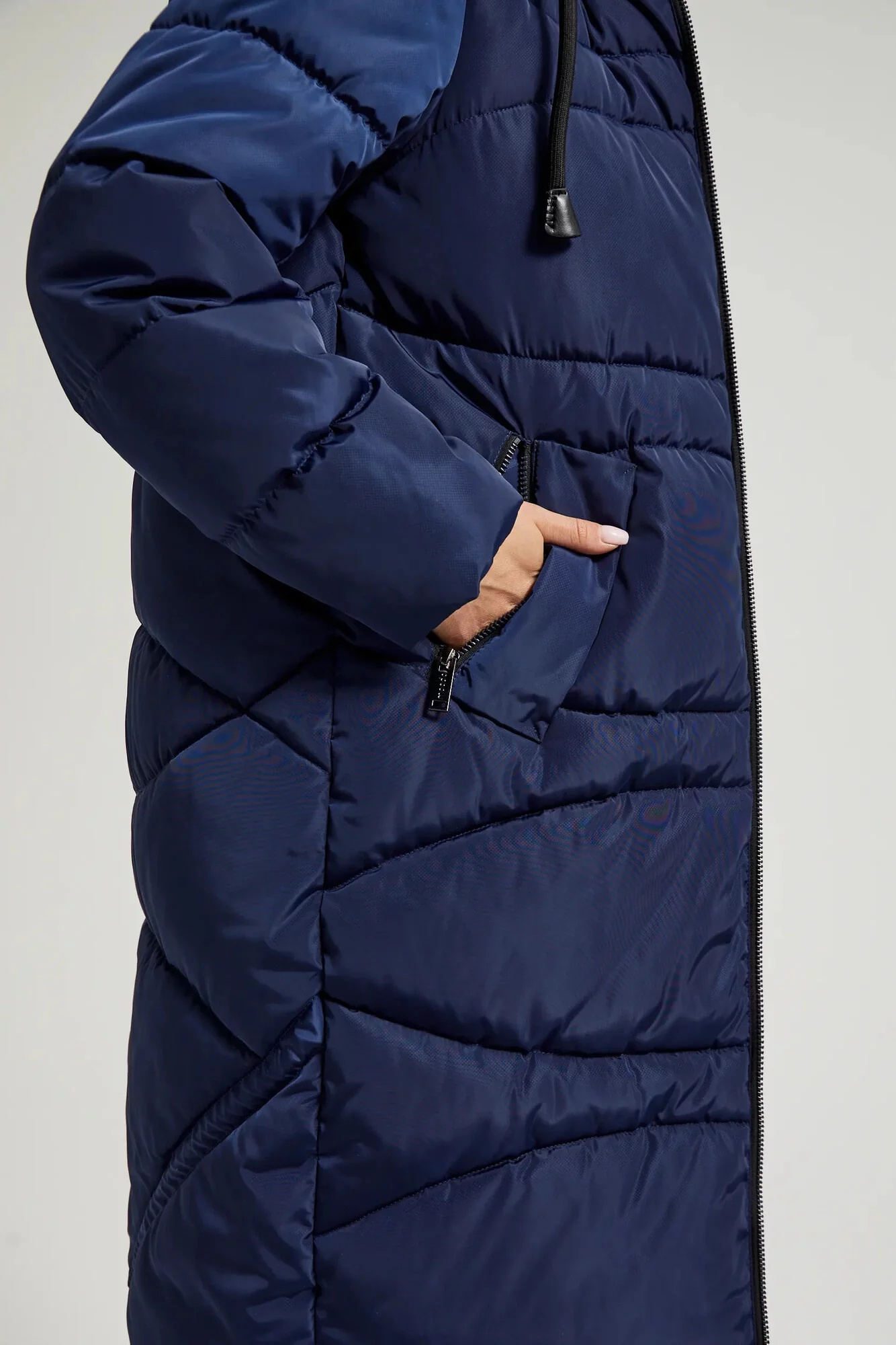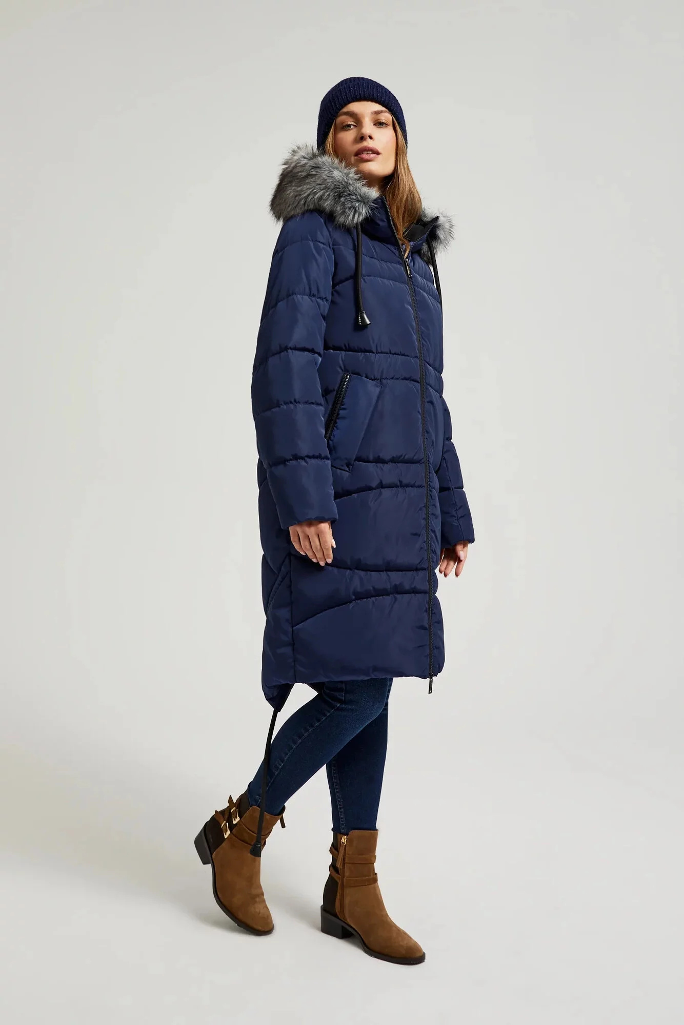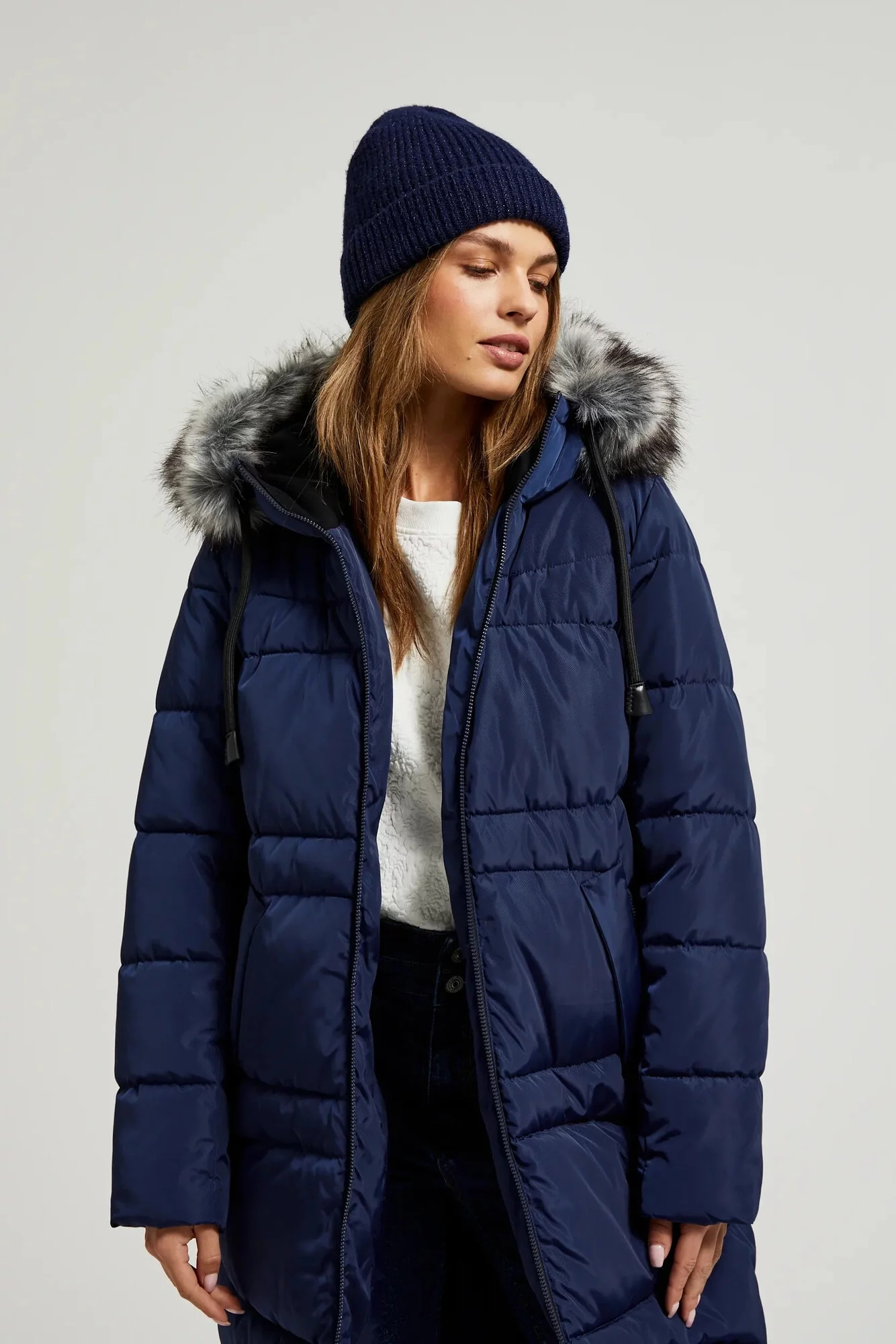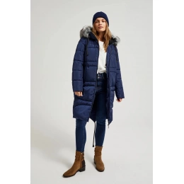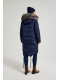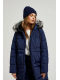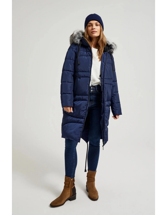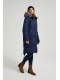 100% POLYESTER Zimní prošívaná bunda v tmavě modré barvě, ideální na chladné dny. Vyrobena z hladkého polyesteru, zateplená a podšitá, zajišťující teplo a pohodlí při nošení. Má praktické kapsy, prošívání a kožešinu na kapuci. Zapínaná na zip, sahající pod kolena, dokonale se osvědčí během mrazivých dnů.