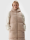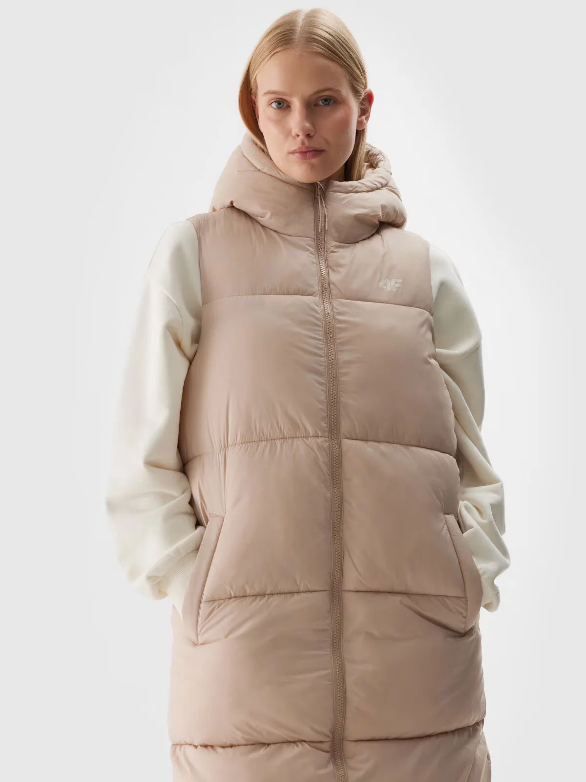 Dámská dlouhá péřová vesta je vybavena integrovanou kapucí s nastavením objemu. Krk je krytý vysokým límcem, který dále chrání před chladem a větrem.