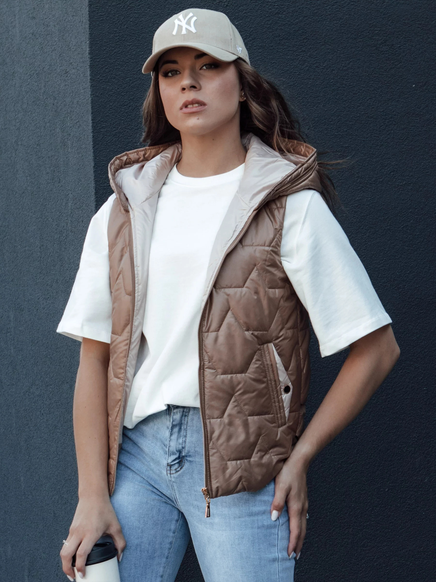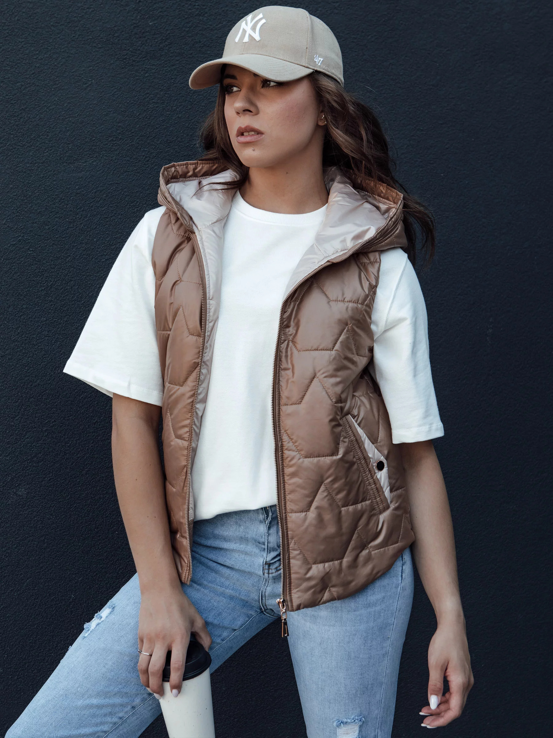Tato prošívaná vesta asymetrického střihu je ideálním doplňkem mnoha jarních stylizací.