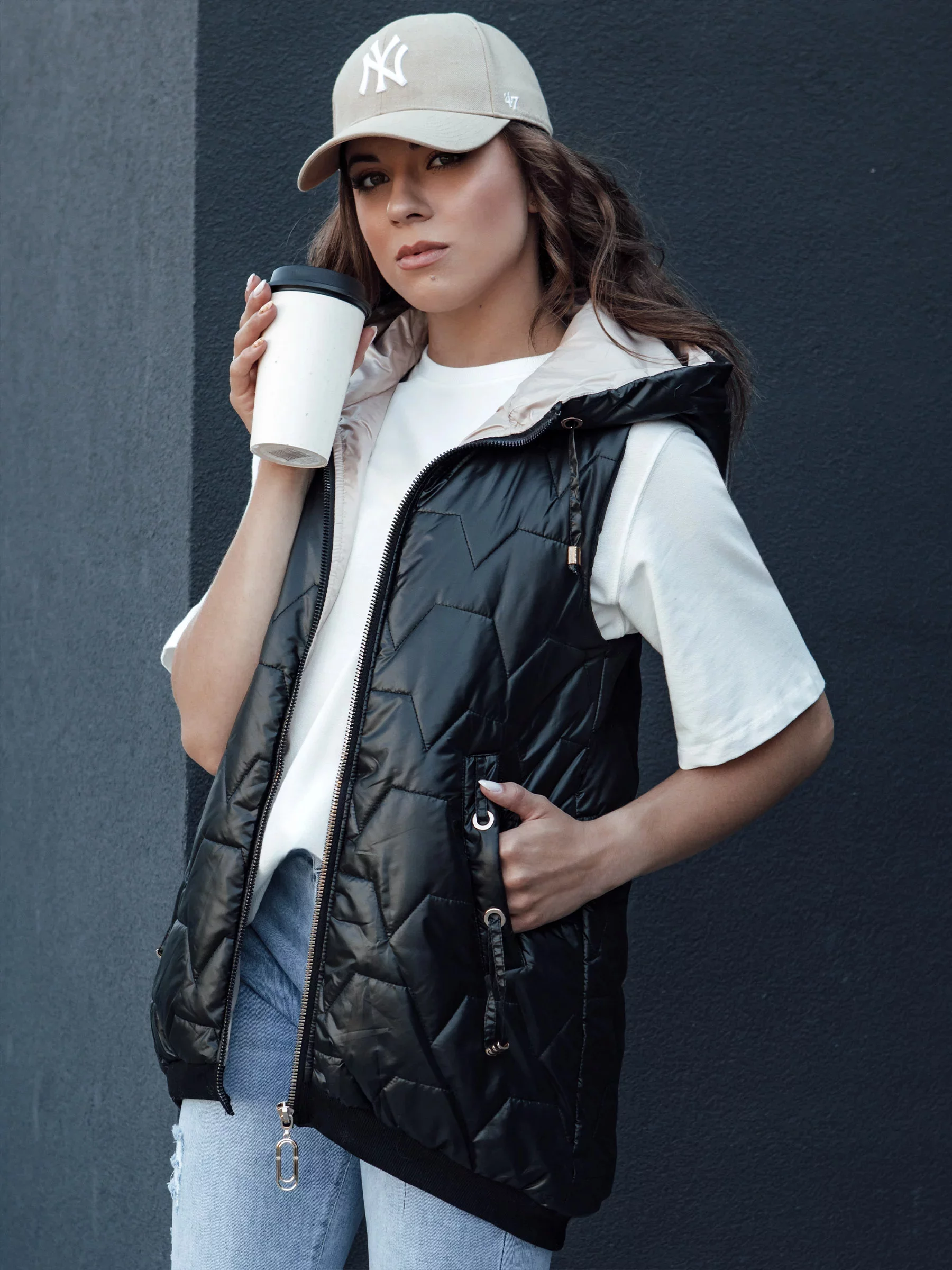 Tato prošívaná vesta s asymetrickým střihem je ideálním doplňkem mnoha jarních outfitů.