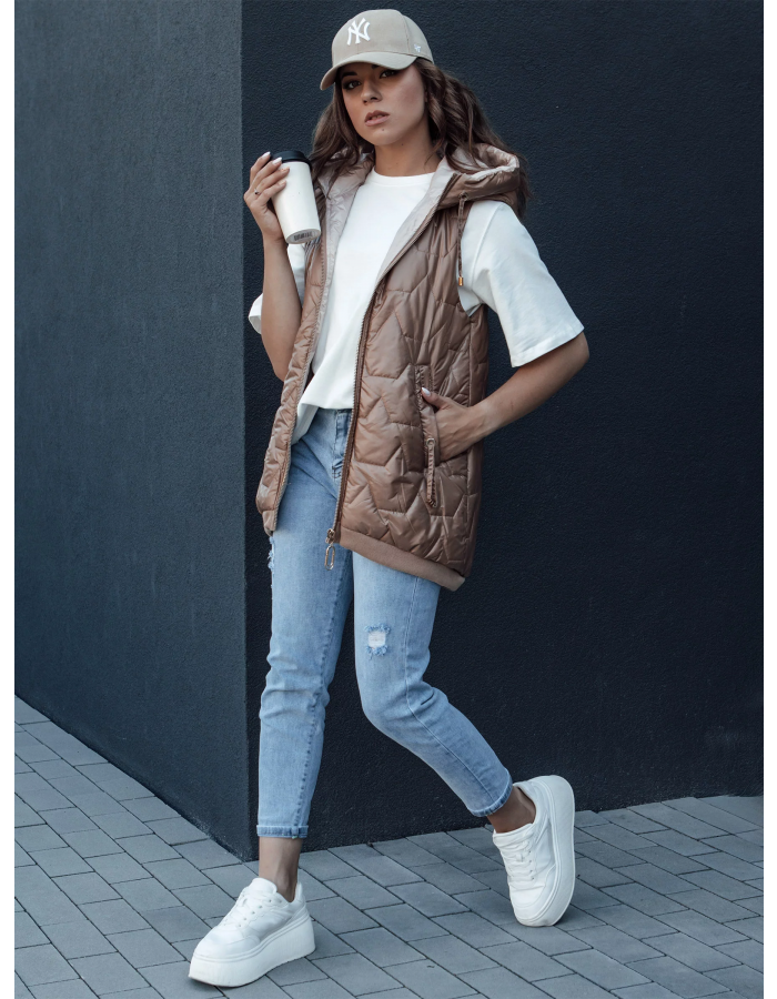 Tato prošívaná vesta s asymetrickým střihem je ideálním doplňkem mnoha jarních outfitů.