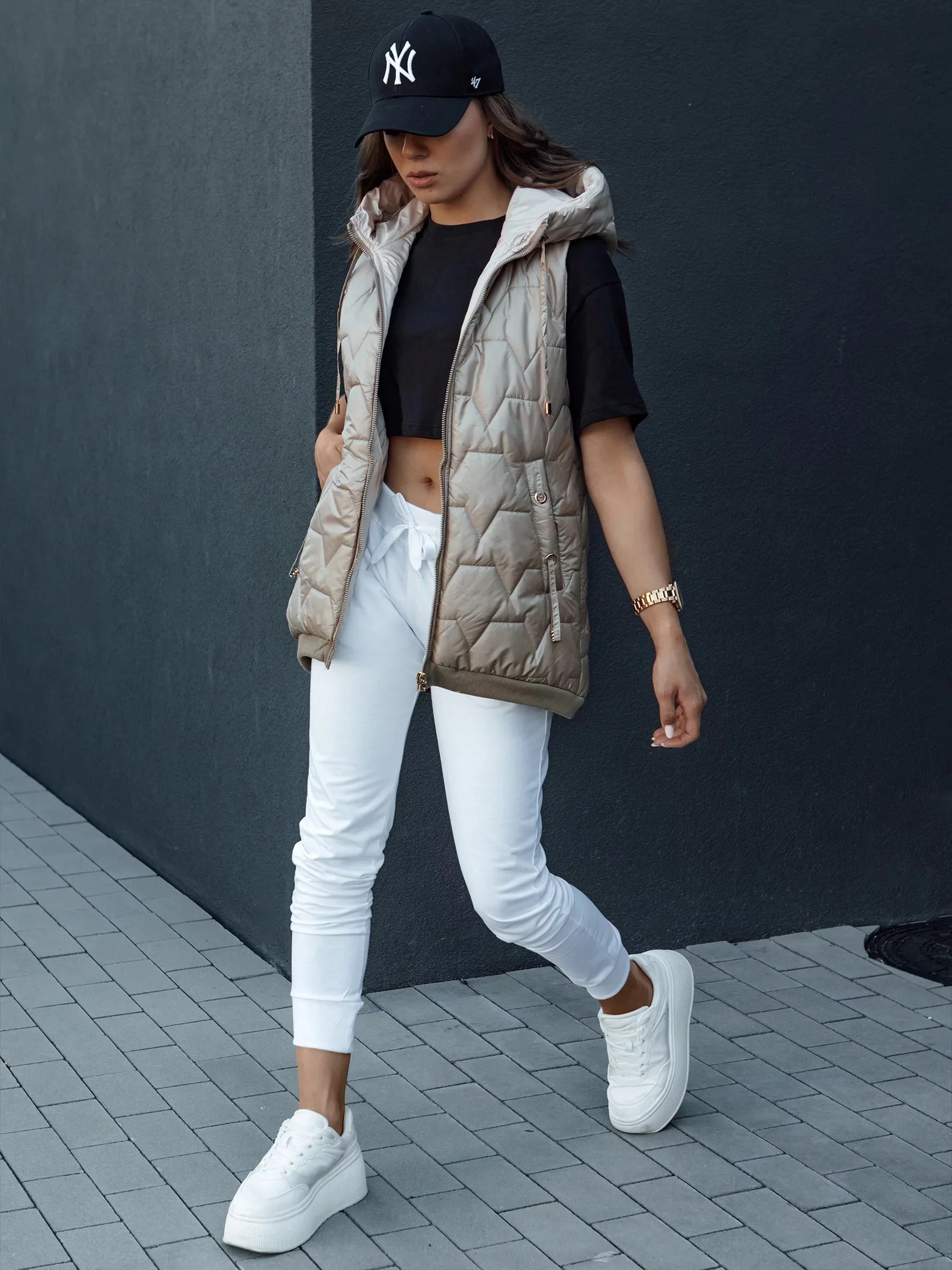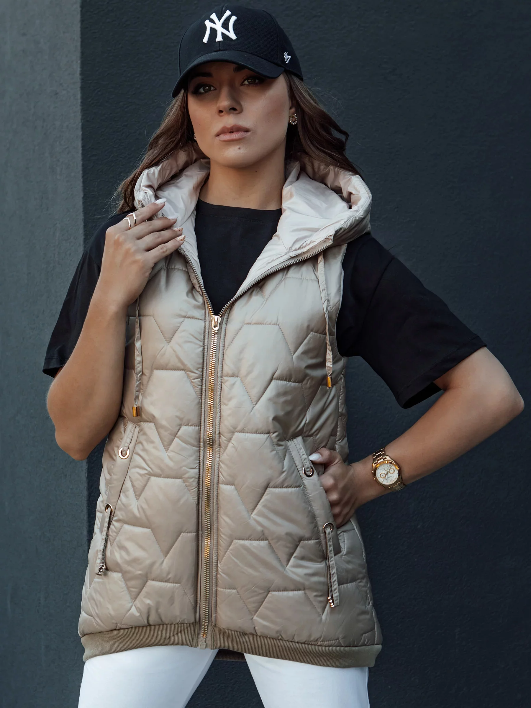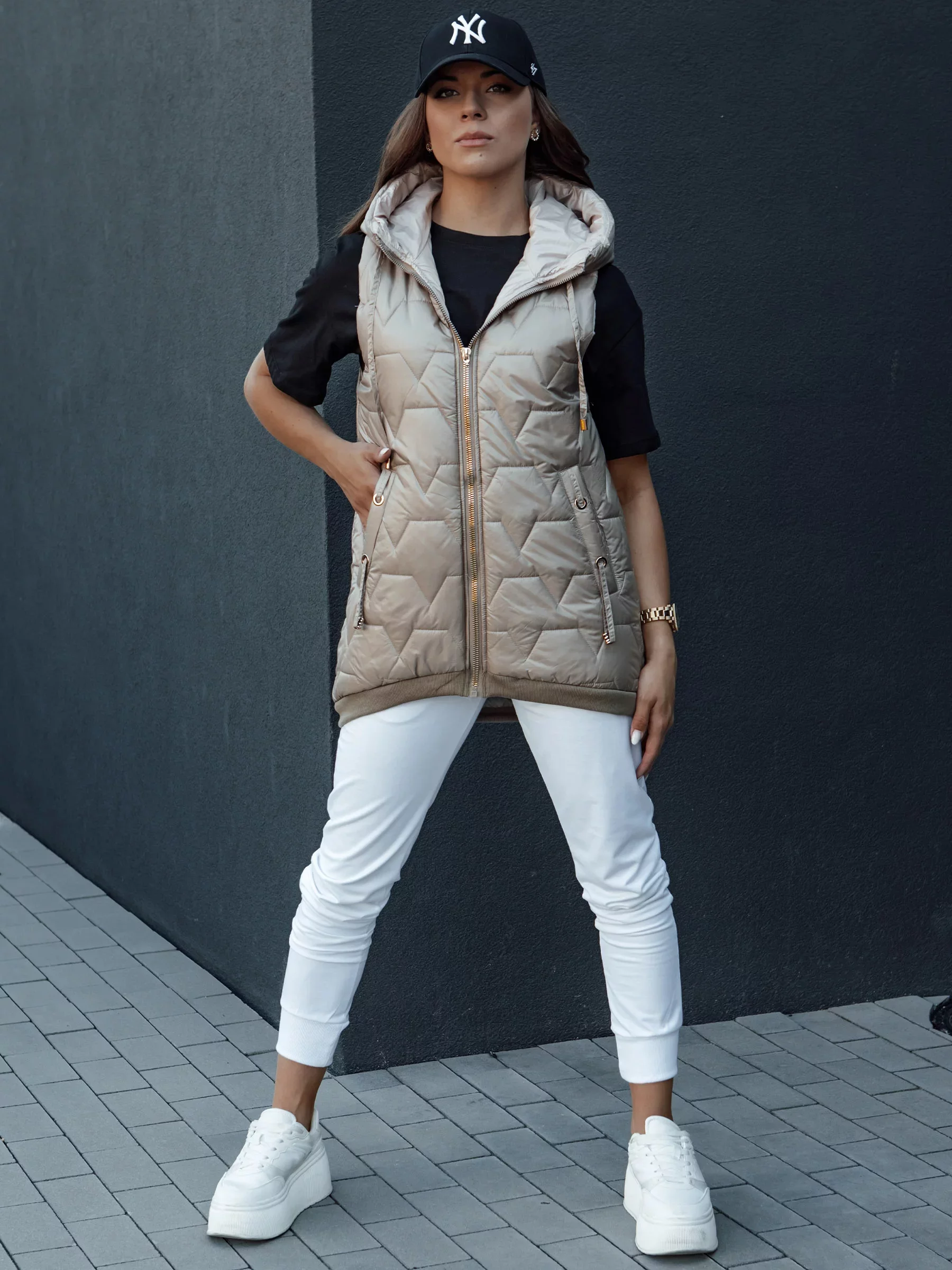 Prošívaná vesta s kapucí je nezbytností v každém šatníku. Dokonale se hodí k běžným stylizacím a dodává jim sportovní šmrnc. Lehká, a zároveň teplá, ideální na podzimní a zimní dny. Díky univerzálnímu střihu se hodí k džínům, teplákům i sukním. Funkční kapuce a pohodlné kapsy jsou dalšími přednostmi tohoto modelu. Objednejte si ještě dnes a přesvědčte se, jak snadno lze spojit styl s pohodlím.