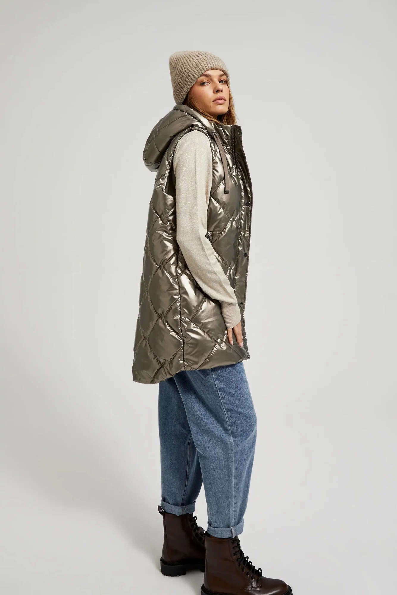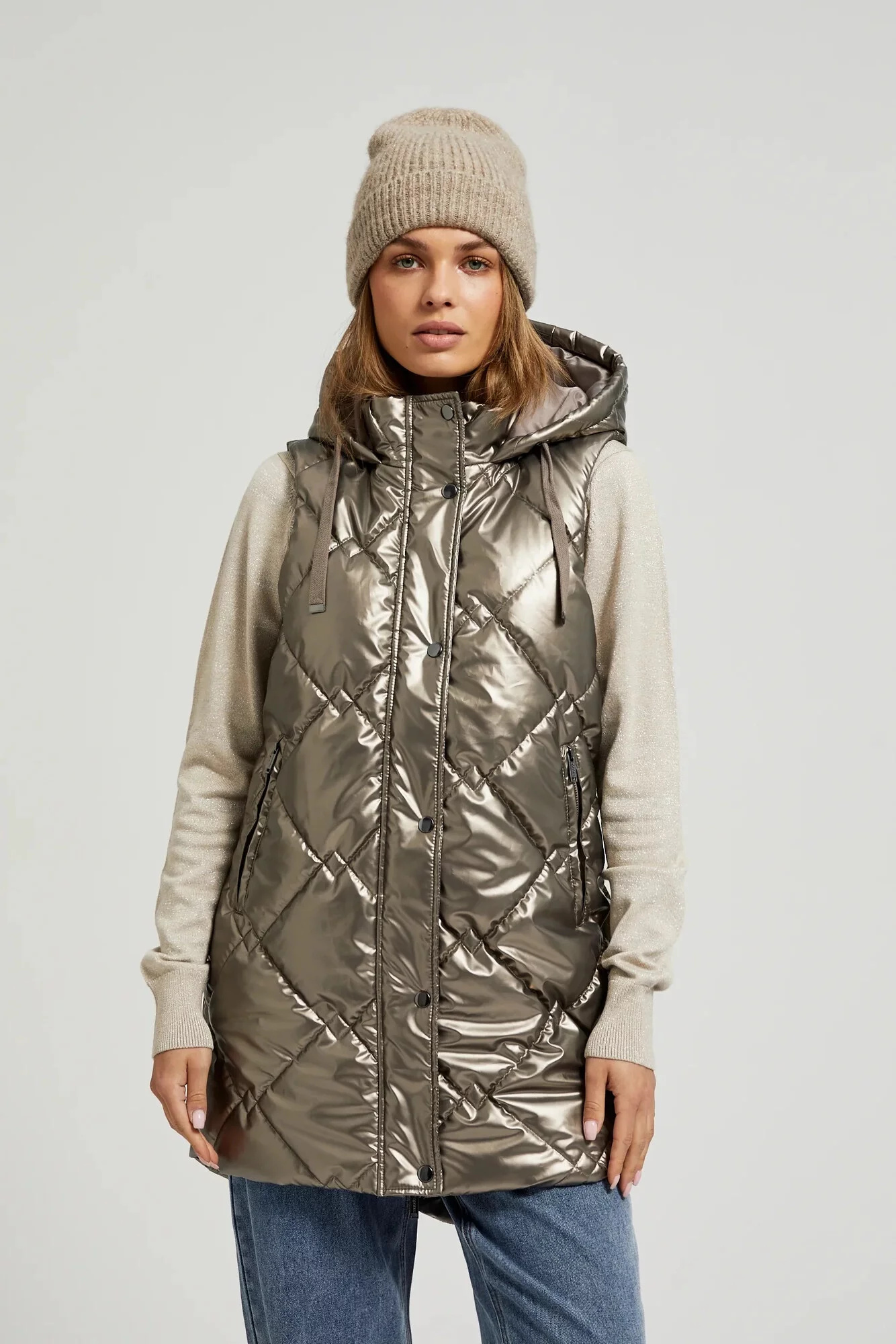 Dámská prošívaná vesta s kapucí MOODO - béžová Velikost: XS