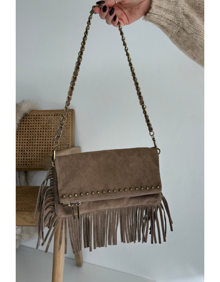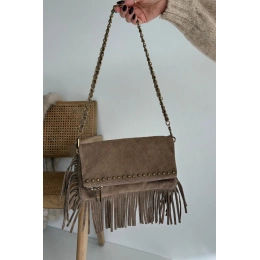 Dámská kabelka Narella z kvalitního semiše v tmavě béžové barvě spojuje elegantní design s moderním doplňkem – třásněmi a řetízkovým popruhem. Kompaktní velikost a precizní zpracování zajišťují pohodlné nošení a nadčasový vzhled, ideální pro denní i večerní příležitosti.