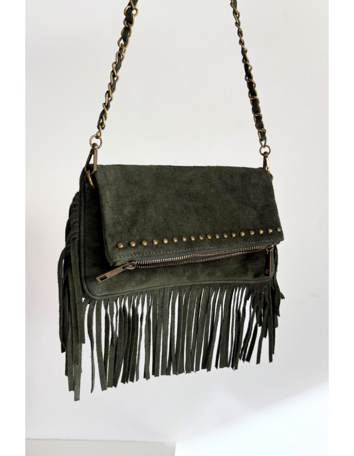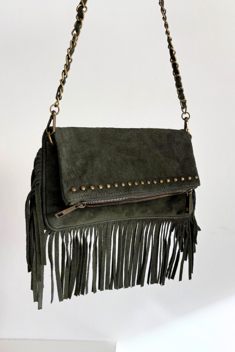 Dámská kabelka Narella z kvalitního semiše v tmavě zelené barvě spojuje elegantní design s moderním doplňkem – třásněmi a řetízkovým popruhem. Kompaktní velikost a precizní zpracování zajišťují pohodlné nošení a nadčasový vzhled, ideální pro denní i večerní příležitosti.